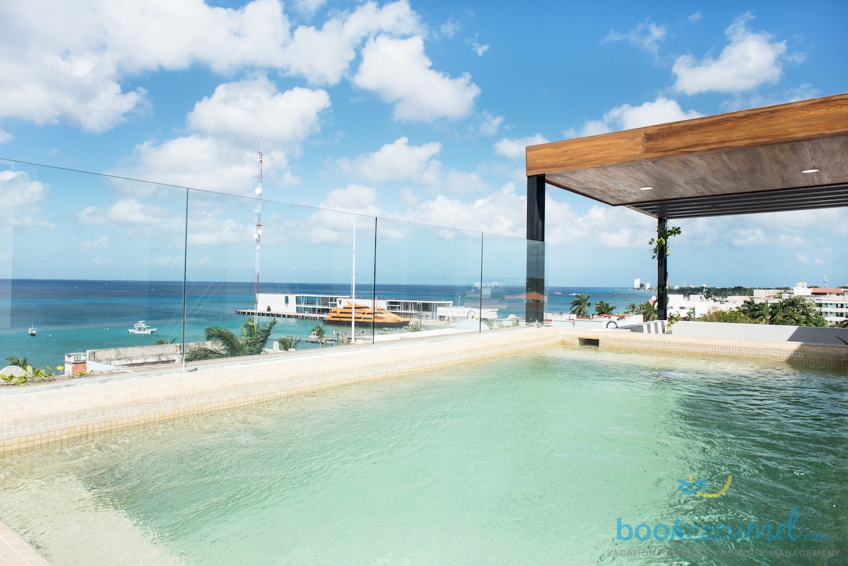 Şehrin merkezinde, kral yataklı ve gömme dolaplı, modern, iyi donanımlı 1 yatak odası. Feribota 3 dakika yürüme mesafesinde ve kasaba meydanına 1 blok mesafede, kafelere, restoranlara ve belediye Mercado'ya birkaç adım mesafedesiniz. Havuzlu ve 360° manzaralı çatı katı, donanımlı spor salonu. Su manzaralı kendi terasınızdan gün batımını izleyin. Nespresso kahve makinesi, ocak, mikrodalga fırın, tam boy buzdolabı/dondurucu, şişe su ve baharatlar mevcuttur. Güzel Cozumel'de evinizden uzakta eviniz.