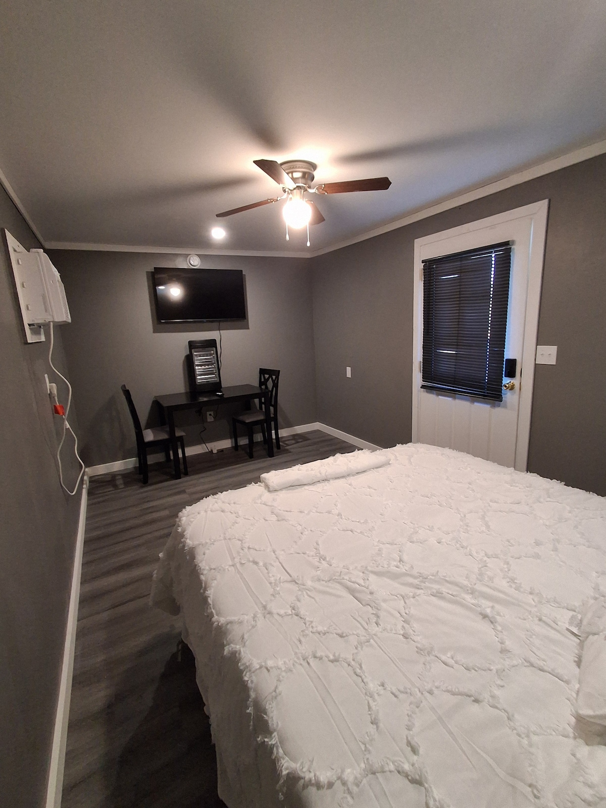 Anybody say glamping?!?! This small cabin has one queen size bed. No plumbing, but is conveniently located next to our very nice bath/laundry house. Where you can take advantage of our restroom, shower , washer and dryer. This cabin is located on our 6 lot RV park. We also have a playground and dog park.