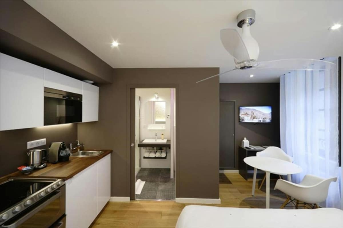 Stüdyo oda No. 5, Creuse nehri kenarındaki çatı katında ikinci kattadır. Çağdaş bir tarzda dekore edilmiş ve tasarım mobilyalarla döşenmiştir. Kat meşe parke. Bir küçük mutfak (bulaşık makinesi, fırın, buzdolabı, tabaklar vb. ile tam donanımlı), NESPRESSO makinesi, gardırop, çalışma masası, yemek masası ve 2 koltuk, çift kişilik yatak (160 cm) ve radyo dinlemenizi sağlayan 32 inç akıllı TV içerir.