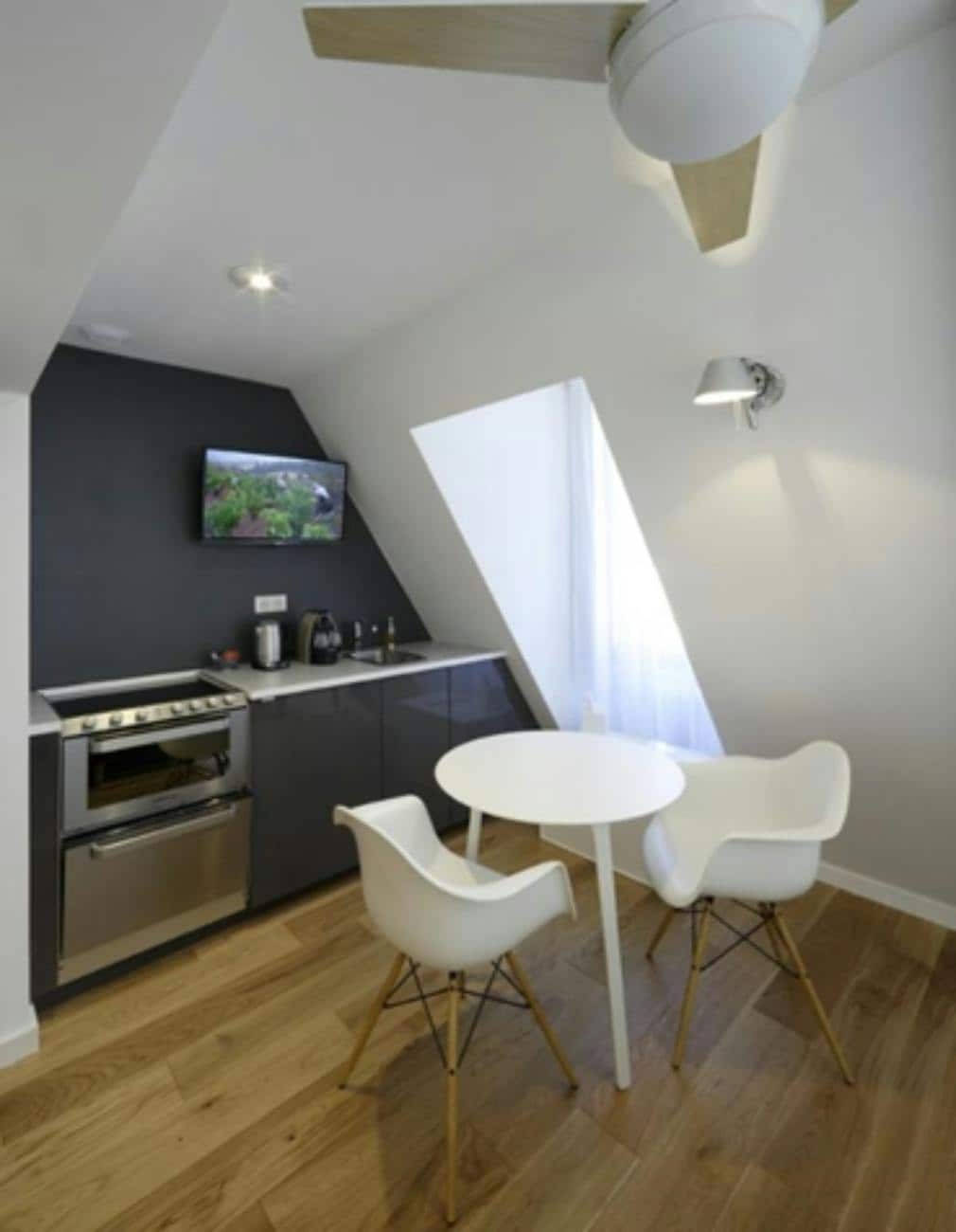Suite No. 9 located on the second floor of a 17th-century building. It is decorated in a contemporary style and furnished with designer furniture. The floor is oak parquet. It includes a kitchenette (fully equipped with a dishwasher, oven, fridge, dishes, etc. ), a coffee machine, a storage wardrobe, a desk, a dining area with a table and 2 armchairs, a double bed (160 cm), a sofa bed for two people, and two smart TVs (32 and 40 inches) that also allow you to listen to the radio.