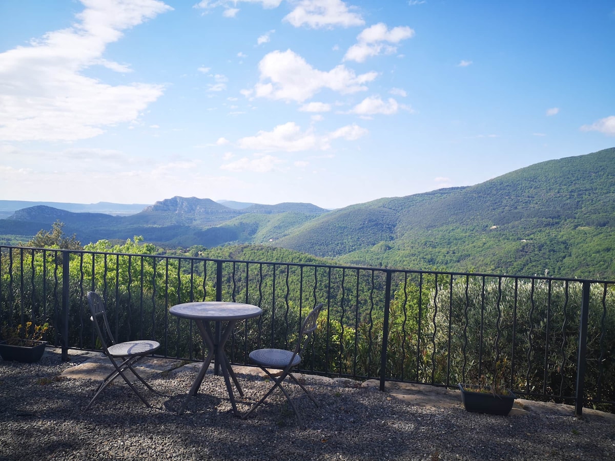 GR 6 -7 kıyılarındaki Cevennes Millî Parkı'nda, büyük bir baskın terastan dağın 50 km'den fazla muhteşem manzarasına sahip bu evde kalacaksınız. Yalnız bir kişi veya bir çift için. Bağımsız banyosu ve tam donanımlı mutfak alanı olan 30 m² geniş bir oda. 24 saat internet. Dinlenmek ve uzaktan çalışmak için ideal bir yer. Nevresimler temin edilir. Sıcaklığa bağlı olarak Mayıs ortasından eylül sonuna kadar doğal havuz. Dikkat, patika ve basamaklarla spor erişimi.