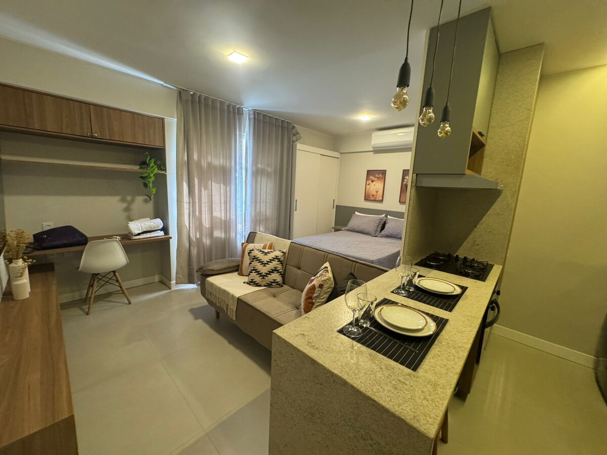 Kendinizi evinizde hissedin, hamakta uzanın ve kiti evinizin bir parçasıymış gibi kullanın. Kit, klima, minibar, wi-fi, netflix TV ve çeşitli ev eşyalarına sahiptir. Binada 24 saat kapıcı, asansör ve kapalı garaj bulunmaktadır ve Brezilya'nın en iyi bölgelerinden birinde bulunmaktadır, pazarlar, barlar, restoranlar, çamaşırhaneler, eczane, fırın, güzellik salonu, smart fit, bankalar ve yürüyüş ve egzersiz parklarına yakındır.