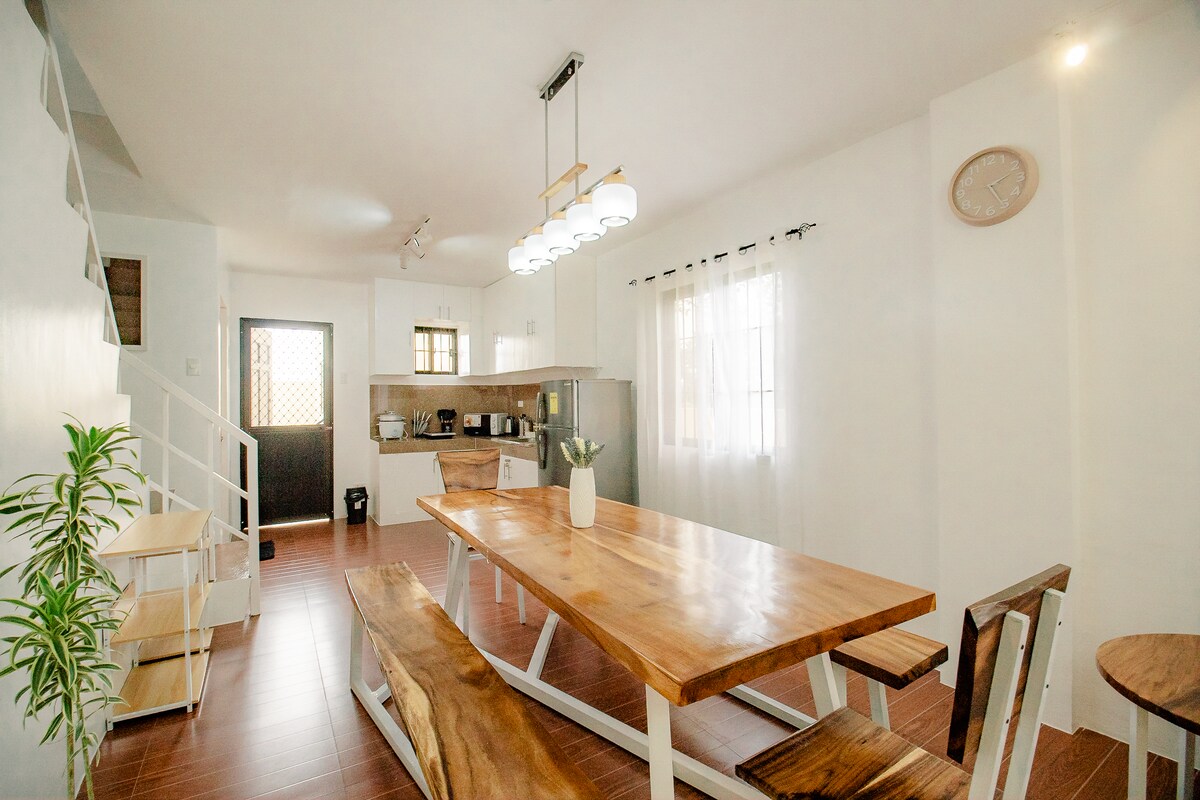 MINIMALIST SCANDI-INDUSTRIAL DUPLEX short drive to famous Balay Dako, Starbucks Hiraya, Leslies, RSM, Bag of Beans Charito, Farmers Table, Ayala Serin Mall, Lourdes Church & Sky Ranch House has 2 bedrooms with aircon, living area with sofa beds, 3 T&B with shower heater, dining, kitchen, workstation, backyard with game room and a parking garage for 1 Sedan or SUV. Enjoy the PLDT Fiber WIFI 35mbps, 55” Android TV with NETFLIX, 48” Foosball & board and card games for bonding.