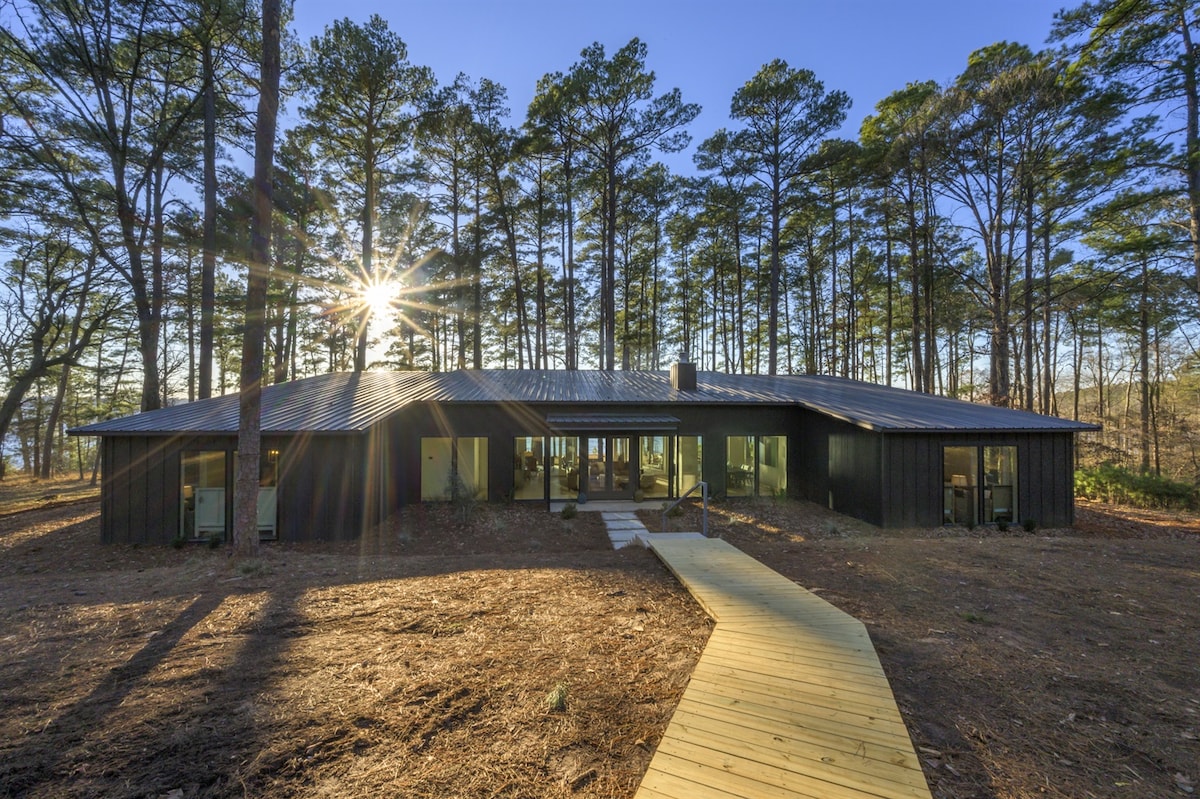 Come relax, unplug and immerse yourself in nature. Enjoy our wonderful view of Lake O' the Pines from this stylish cabin set up on the hill. The two level front porch with views of the lake, woods, sunsets, and wildlife is the perfect spot to unwind. Near Jefferson Tx and Caddo Lake. *read listing fully before booking* There is no wifi and no microwave. Only guests who will respect my beloved home please. No lake access.