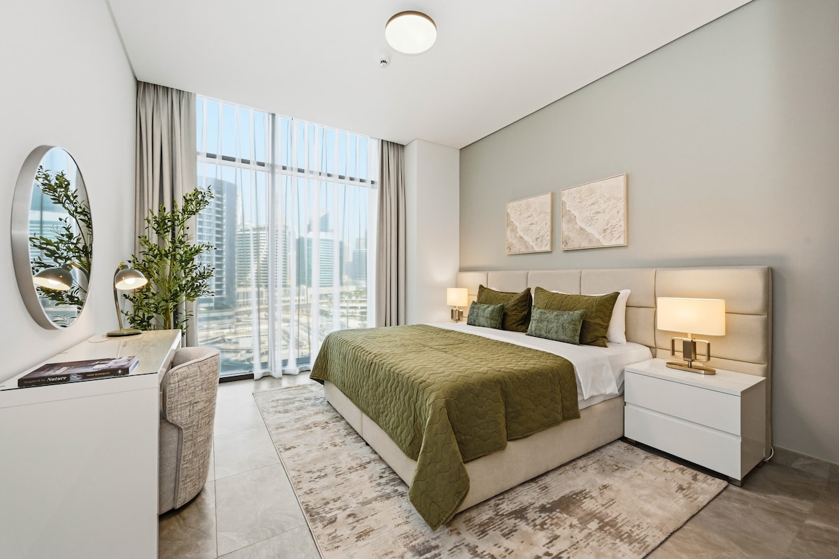 Business Bay, Ahad Residences'taki Cloud 18 Studio Apartmanına hoş geldiniz. Tek başına seyahat edenler, çiftler veya küçük aileler için mükemmel olan, pelüş queen boy yatak ve konforlu tek kişilik çekyat ile sakin ve rahat hissettiren ahşap iç mekanlarla tamamen döşenmiş, aydınlık evinize adım atın. Temiz, minimalist dekor ve yerden tavana pencereler mekânı ışıkla doldurur ve Business Bay siluetinin ve mimari simgelerin geniş manzarasını sunar.