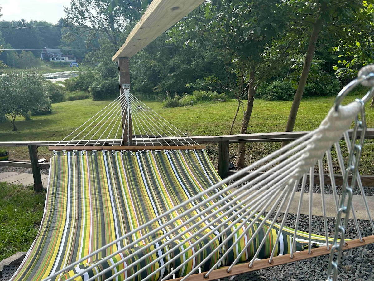 Akarsu ve verandası olan ormanlık Livingston Manor Oasis