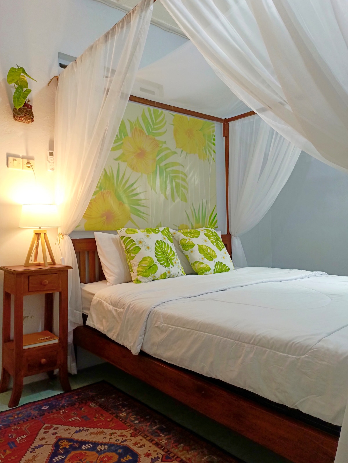 Geniş bir terası ve yarı açık mutfağı olan bu geleneksel ahşap ev, pirinç tarlalarına bakan güzel bir panoramik manzara sunuyor. Kırsal kesimde olmasına rağmen, Jogja'nın şehir merkezine sadece 20 dakika uzaklıktadır. Yakınlarda yaşayan ve yıllardır bu bölgeye aşık olan Alman-Endonezyalı bir aileyiz. Tarlalardaki serin esinti ve doğanın yatıştırıcı sesleri sizi rahatlamaya ve günlük hayatı unutmaya davet ediyor. Sağlıklı, ev yapımı bir kahvaltı dahildir.