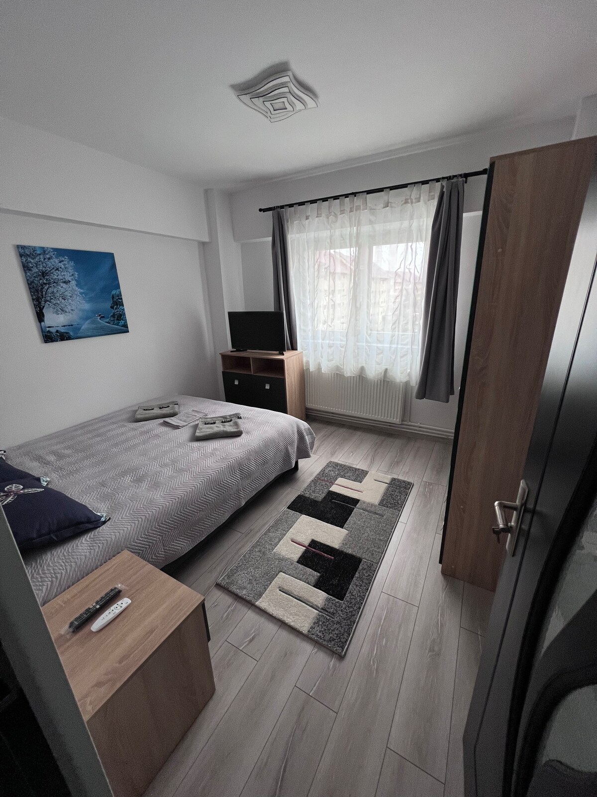 Yeşil kuşak ve ücretsiz otoparkı olan sessiz bir ortamda sade küçük bir stüdyo oda. Oda çift kişilik yatak ve çekyat ile donatılmıştır,bu nedenle 4 kişi için yeterli olabilir. Odanın büyüklüğü bundan sonra olacak, ancak 2 yetişkin ve 2 çocuk için tavsiye ederim, 4 yetişkin biraz dar.
