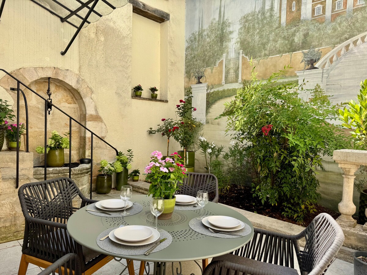 Dijon şehir merkezinde, antikacıların bulunduğu semtte, ünlü Dijon "baykuşu" ve Burgonya düklerinin sarayının yakınında, alışveriş veya bar olmayan, az geçişli sakin bir sokakta, zemin katta 90 m2'lik daire. Özel giriş. Yemek alanına sahip özel avlu. Bourgogne şaraplarının tadımının yapıldığı tonozlu mahzen; dart oyunu; Bluetooth hoparlör.