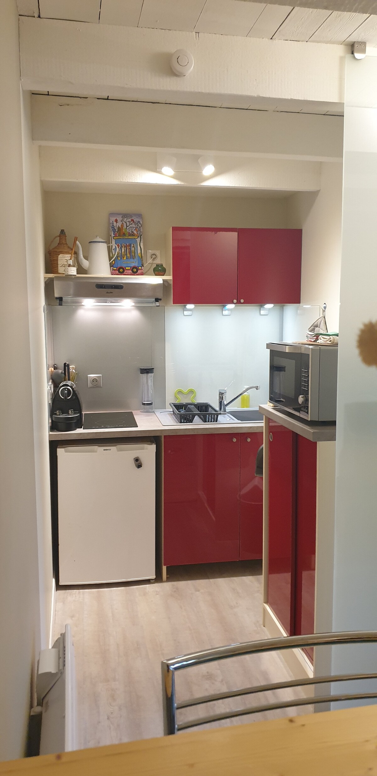 Küçük ev zevkli bir şekilde yenilendi. Zemin katta küçük mutfak ve banyo (duşakabin). Üst kattaki büyük yatak odası, dolap ve raflar. Yüzey alanı: 25 m2 zemin kat ve 20 m2 yatak odası. Zemin katta, kaliteli çekyat. 4 kişi için yatak takımı sağlanmıştır (yalnızca yatak takımı ve masa örtüsü). Banyo havluları ve yüz havluları için: Kişi başı 2 €.