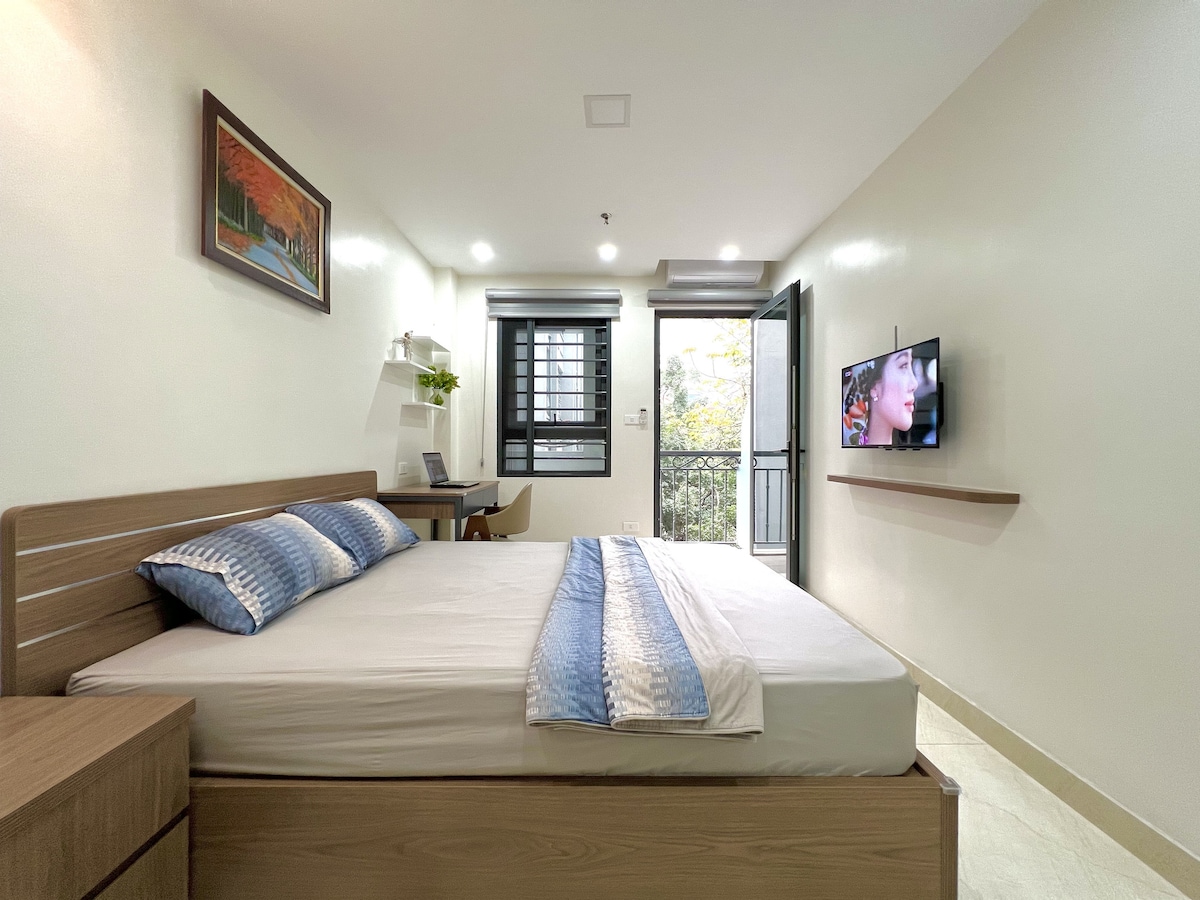 🌸 Love Studio – 3rd Floor, City Center Hanoi Sweetly decorated 30m² studio with bright windows and peaceful vibes. Features a comfy double bed, work desk, private kitchen, fridge, ensuite bathroom, and 55” Smart TV with Netflix. Enjoy sunshine and city views from the 7th-floor balcony. Ground floor has a shared kitchen, cozy living area, and free self-serve coffee. Free motorbike parking. Ideal for couples, business travelers, or long stays – private, cozy, and convenient
