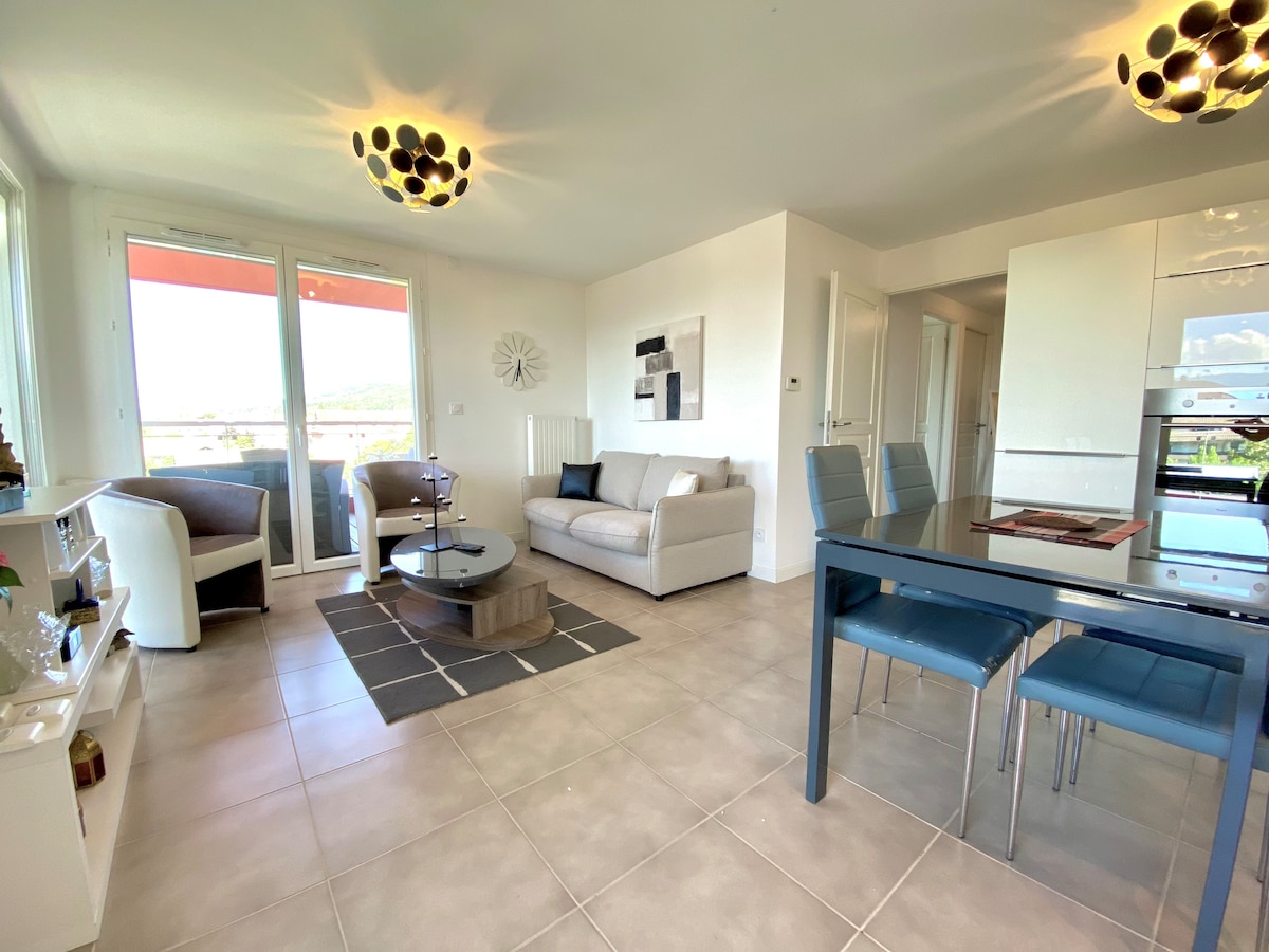 Dinlenmek ve güneşin tadını çıkarmak için donanımlı mutfağı, tek yatak odalı, oturma odasına veya yatak odasına erişimi olan iyi bir balkona sahip güzel, rahat ve aydınlık daire. Göl ve dağ arasında konaklama için dairemiz plaja (Tougues) birkaç dakika, İsviçre sınırına arabayla 8 dakika, Yvoire köyüne 10 dakika, Cenevre ve Thon - les - Bains'e 20 dakika, kayak merkezlerine 40 dakika, Annecy ve Chamonix'e 1 saat mesafededir.