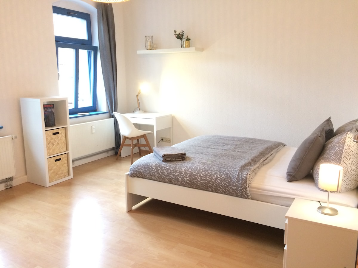 Burası Dresden Neustadt'ın merkezinde bulunan küçük, sakin, 2 odalı dairemiz. Daire, bir apartmanın arka tarafında, 3. katta bulunmaktadır, tam donanımlı bir mutfak, duş teknesi olan bir banyo, televizyon ve çekyat bulunan bir oturma odası ve elbette çift kişilik yataklı bir yatak odasından oluşmaktadır. Küçük çocuklar için seyahat beşiği ve sandalye mevcuttur ve her zaman kullanılabilir. Otopark dairenin hemen yakınında bulunmaktadır.