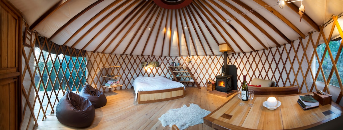 El yapımı ve yün yalıtımlı yurt yıl boyunca sıcak ve rahattır ve geceleri yıldızlara bakmak için bir tavan penceresi vardır. Motueka nehir vadisi ve ötesindeki Tasman Körfezi'nin muhteşem manzarasına sahip açık mutfak, banyo/duş ve kompost tuvaleti ile yerel çalılıkta özel bir dinlenme yeri.
