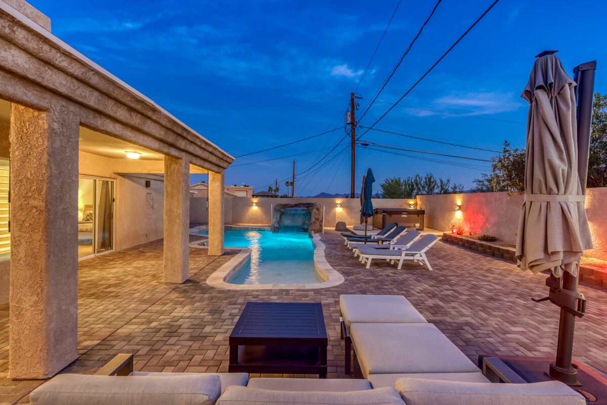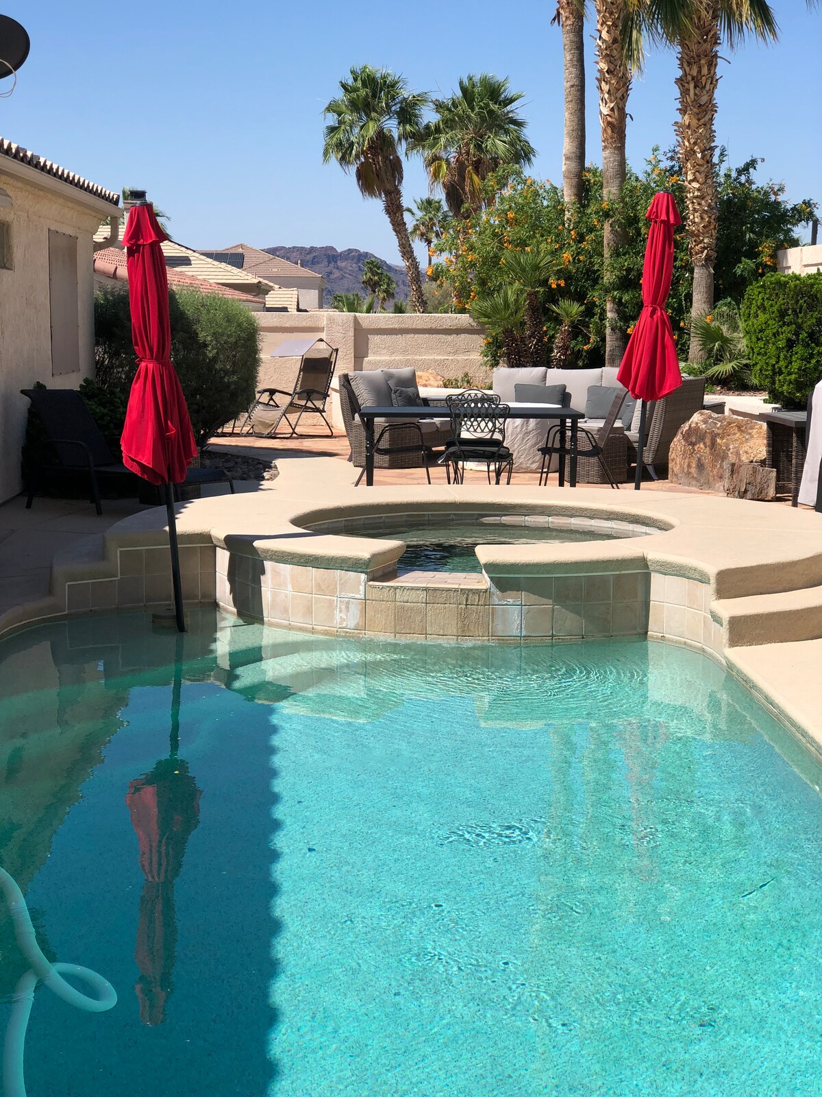 Cennetin bir parçası! 3 yataklı 2 banyolu ev 10 misafir barındırır ve merkezi konumdadır. Londra Köprüsü, şehir merkezi, tekne iskelesi ve parti sevenler için barlara 5 dakika mesafededir! Kapalı veranda alanı / havuzda/spada dinlenirken veya ızgarada yemek pişirirken Bluetooth hoparlörlerle açık havada yemek yiyebilirsiniz! Ön tarafta bolca park yeri, tekneleri ve off-road araçları barındıracak kapalı otopark, bağlantılarıyla karavan park yeri! Her televizyon Netflix ile yayın yapmaya hazır! Tam donanımlı mutfak. Daha fazla aramayın.