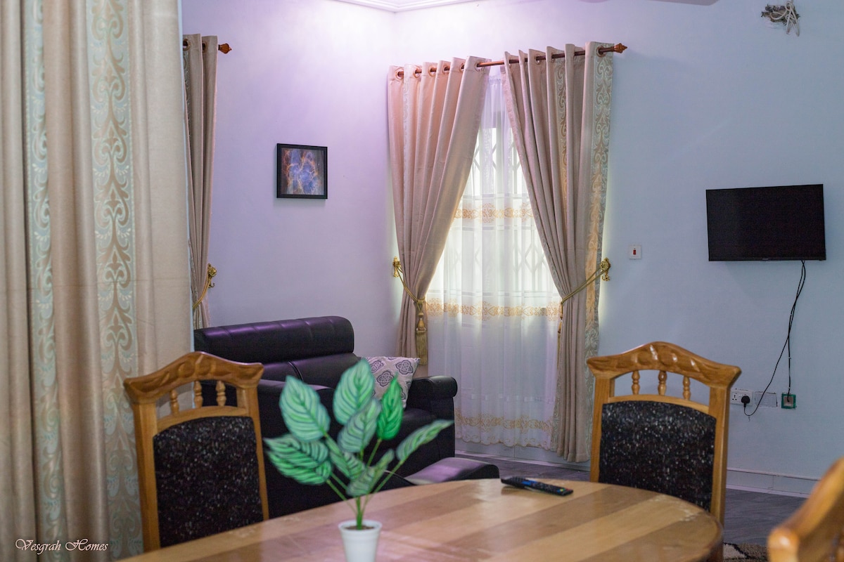 Bu çarpıcı daireye hoş geldiniz. Konforlu yataklarımız kaliteli ithal çarşaflara sahiptir. Yaşam alanları klimalıdır. İyi düzenlenmiş ofise doğru yürüyün. Konut hızlı internet ve yedek güç(klimalar için değil) ile donatılmıştır. Yerel TV kanallarınız ve Netflix'iniz olacak. Mutfak, üst düzey cihazların yanı sıra çamaşırhane ihtiyaçlarınız için bir çamaşır kurutma makinesi ile donatılmıştır. Knust'a yaklaşık 10 dakika, havaalanına 15 dakika, Kumasi şehir merkezine 20 dakika mesafedeyiz.