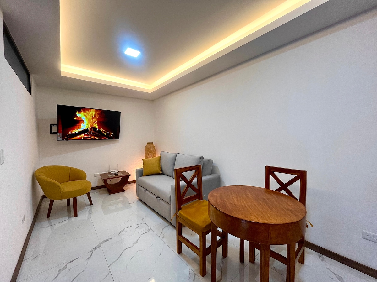 Başkentin en yüksek binalarından birinde zarif bir süitte konaklayın ve Quito'nun en iyi manzarasının keyfini çıkarın Atahualpa Olimpiyat Stadyumu'na, alışveriş merkezlerine yakın. 3 kişilik yatak, çekyat, TV, kablosuz internet bağlantısı, Netflix, donanımlı mutfak. 1 1/2 banyo Çamaşır makinesi, kurutma makinesi, ütü. Spor salonu, teras, çocuk oyun alanına erişim. Islak alanlar, barbekü alanı (uygunluk durumuna ve 48 saat önceden rezervasyona tabidir). Rezervasyon onaylandıktan sonra kimlik istenir.