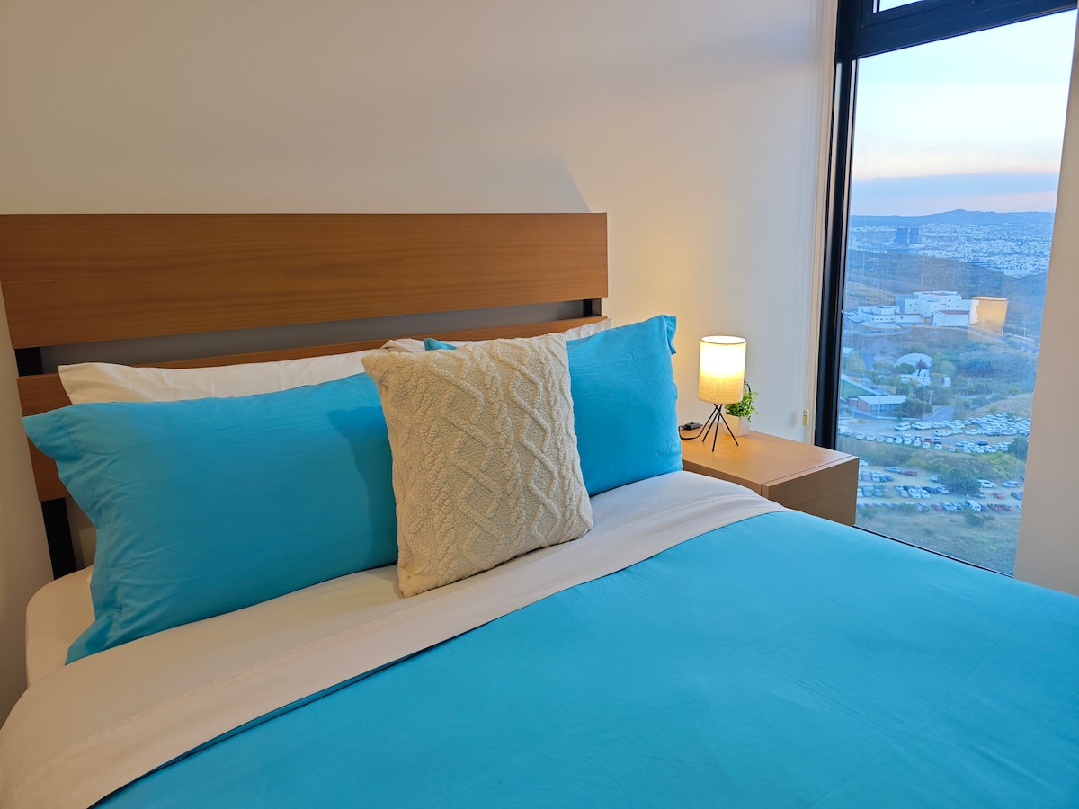 Enjoy a romantic and exclusive experience in this luxury retreat with panoramic views in El Marqués. Located in a hotel-concept condominium with only 80 residences, you’ll have access to an infinity pool, jacuzzi, gym, and premium security. The apartment features a private tub, immersive Sonos sound system, smart lighting, and air conditioning throughout. Ideal for special getaways, celebrations, or simply enjoying tranquility and sophistication just 10 minutes from downtown Querétaro.