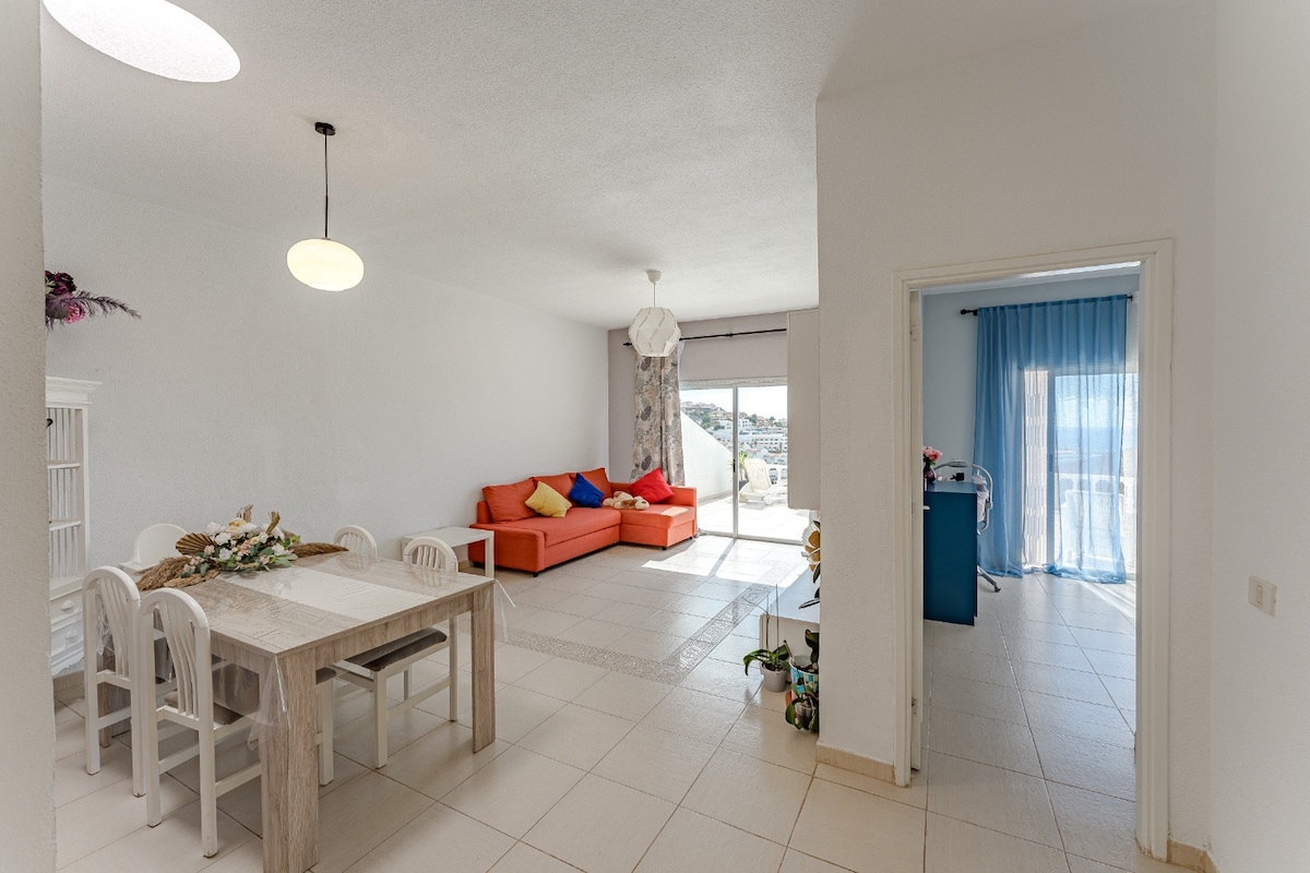 Dairede iki yatak odası, bir banyo, oturma odası-mutfak ve dış mekan mobilyaları, yemek yemek için masa ve gün batımını izlemek için kanepeler ile çok geniş bir teras bulunmaktadır. Daireden çalışabilmek için yüksek hızlı kablosuz internet bağlantısı ve sandalyeli bir çalışma masası bulunmaktadır. Oturma odasında klimalar ve yatak odalarında ayaklı vantilatörler bulunmaktadır. Daire, hem gündüz hem de gece atmosferi ile adanın en ünlü yerlerinden biri olan Playa Américas'a birkaç metre mesafededir.