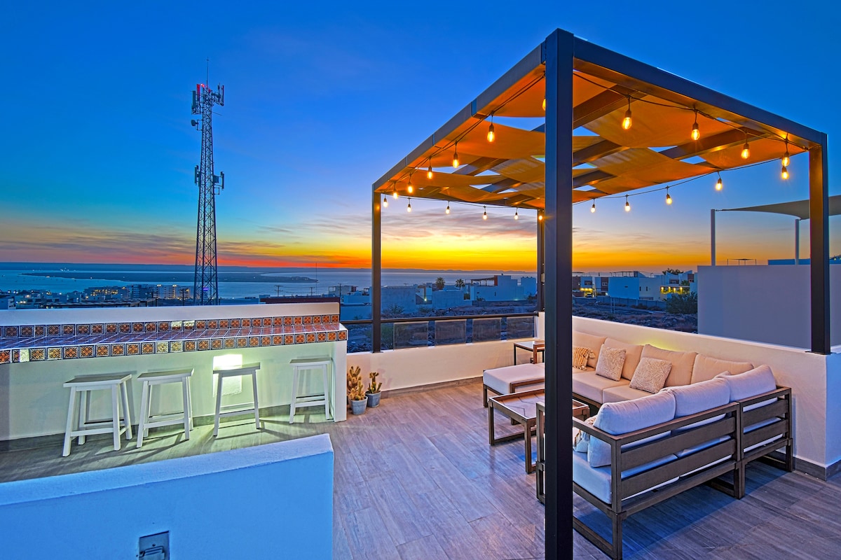 Casa Azurea'ya hoş geldiniz! La Paz'ın lüks, kapalı Palmira semtinde balkonlu, ferah, sakin 2 yatak odalı/2,5 banyolu havuz kenarındaki bu konutta dinlenin. Körfez esintilerinin, Cortez Denizi manzarasının ve Malecón, Marina Palmira ile bölgenin ünlü plajlarına kolay erişimin keyfini çıkarın. Yerel dokunuşlarla modern ve zevkli tasarım, hızlı kablosuz internet bağlantısı, tam donanımlı mutfak, klima ve daire içi çamaşırhane; çiftler, arkadaşlar, aileler veya dijital göçebeler için mükemmeldir. Güvenli park yeri, güvenli ve huzurlu bir ortam burayı ideal bir Baja kaçamağı yapıyor.