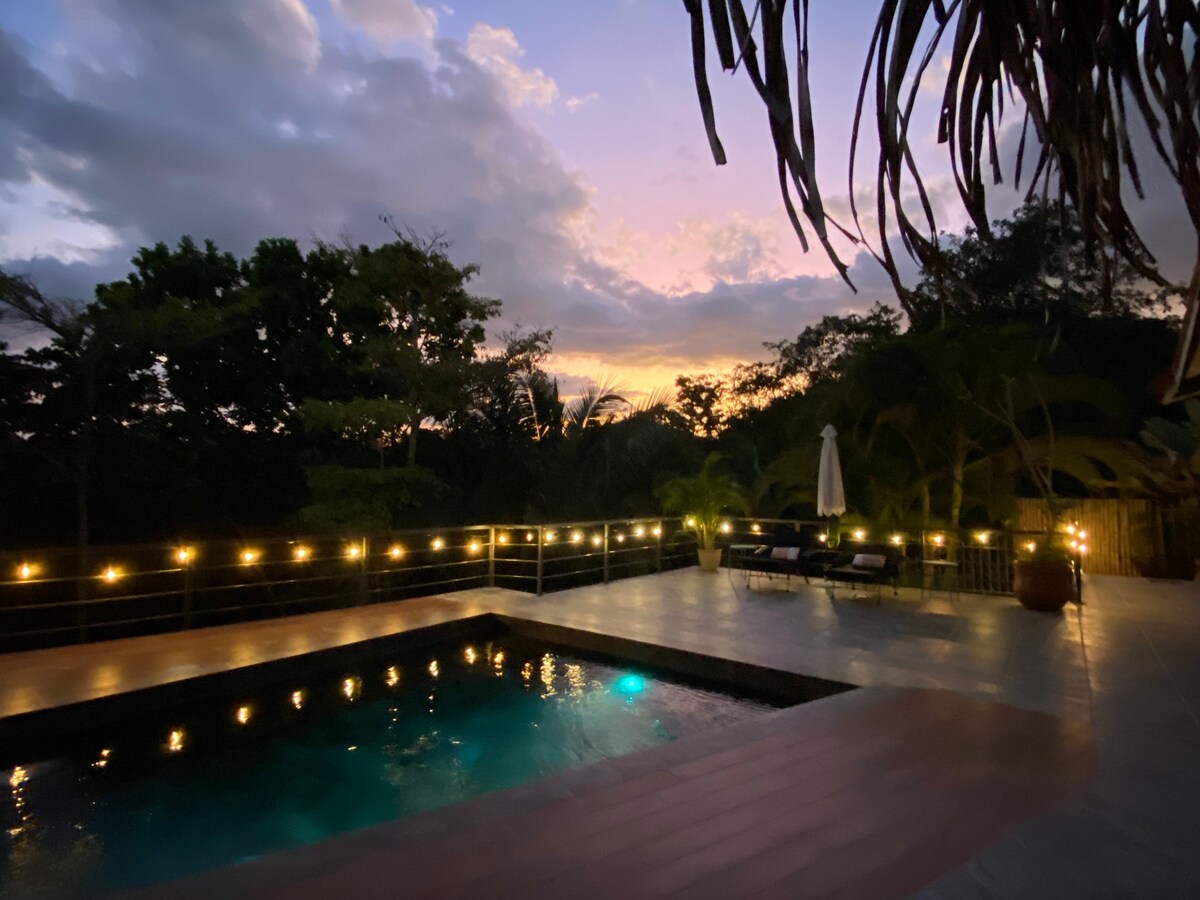 Mevsimlik bir nehre, kelebek bahçesine ve tropikal meyve bahçesine bakan benzersiz Bali esintili ağaç ev. Çoğunlukla mülkte öğütülmüş, Endonezya ve Tayland'ı keşfederken toplanan hatıralar ve oyulmuş ahşap vurgularla tamamlanan yerel kaynaklı kereste ile inşa edilmiştir. Burası kırmızı papağanlar, papağanlar ve tukanların günlük ziyaretleriyle bir kuş cenneti. Playa Hermosa ve Playa Jaco'da dünya standartlarında sörf , okyanus kenarındaki restoranlar ve gece hayatına arabayla kısa mesafededir.