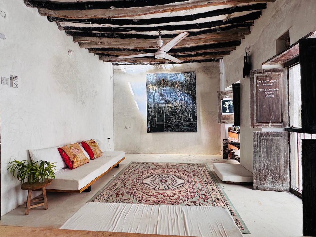 Set along Usita wa Mui, the main street of Lamu Old Town, this flat is the first project of a graduate architect and artist (the host himself). Housed in a 700-year-old Swahili home, it combines history, craftsmanship, and art. The space doubles as a working studio and small gallery with mixed-media works. Facing the lively street, it carries the hum of daily life and stories below — a true immersion into the spirit and creativity of Lamu.
