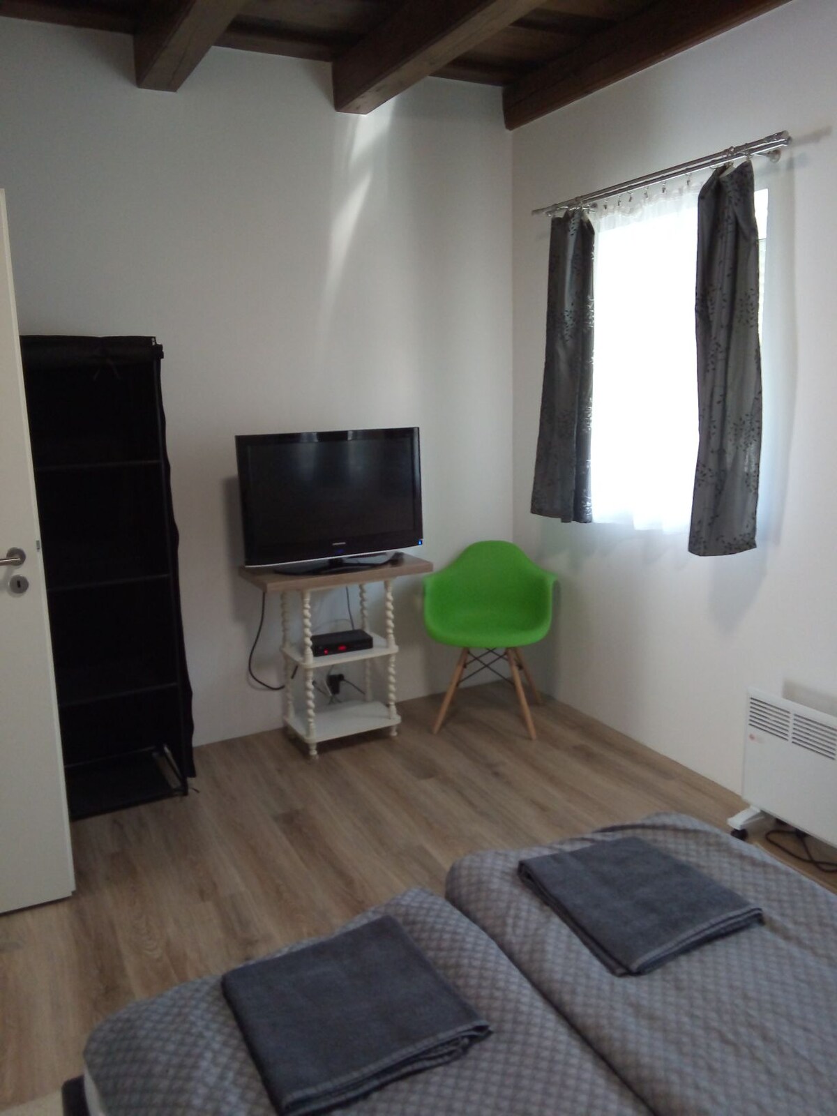 This beautiful large flat in the Heart of Sopron with original wood ceiling from the 15th century is located 1 minutes walk from the old town and centre of Sopron. The 110 m² two floor apartment includes a romantic wood stove fireplace, a fully equipped kitchen, a bathroom with an additional toilet. A cosy and quiet bedroom with a kingsize bed on the upper floor and a second romantic bedroom on the lower floor. Fresh and clean bed and bath linen are provided