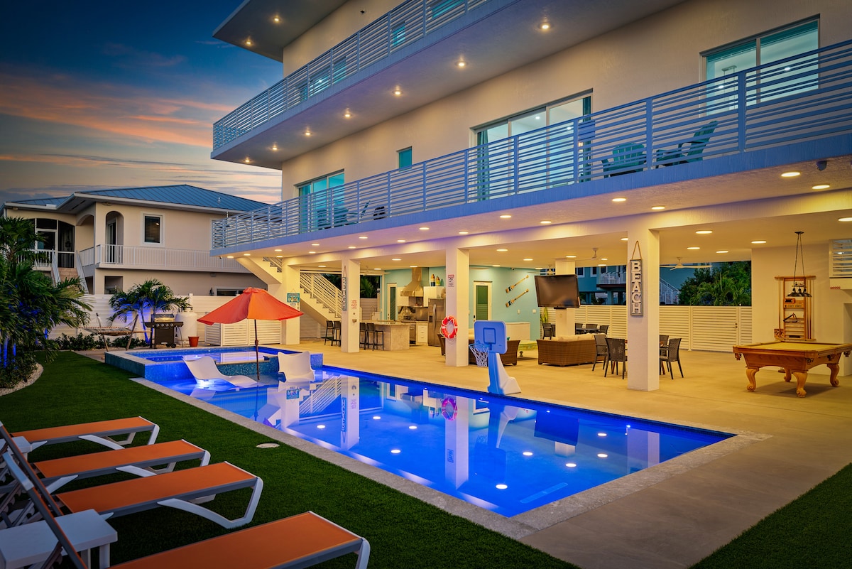 This tropical 6 bedroom 4 bath oceanfront home has a private heated salt water pool and huge outdoor living space. There is beach access, shared dock space and outdoor gazebo to watch sunsets. There is a 3rd story balcony that offers spectacular views of the sunrise and sunset. Bring up to a 24' boat or paddle out on one of the shared kayaks onsite. Fully equipped kitchen, linens, beach towels, a propane BBQ grill and 2 washer/dryers. This home is priced based on the number of guests.
