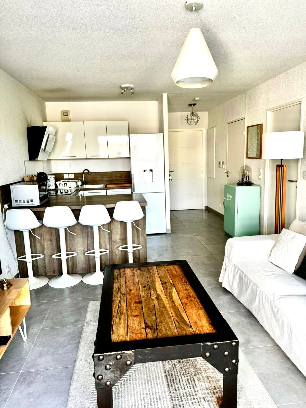 İdeal konumda, her yere yürüyerek ulaşılabilir, plaj, liman ve mağazalar yakın mesafede. Güneye bakan, ağaçlarla çevrili, sakin bir konutta, 1. katta, tam donanımlı (çamaşır makinesi, klima, fırın, TV, wifi, Tassimo kahve makinesi, plancha...). Konut, Amerikan mutfağı olan bir ana odadan oluşmaktadır, hepsi 10m2'lik bir balkona bakmaktadır. 2 ikiz yataklı kapalı bir uyku alanı, oturma odasında 2 kişilik çekyat bulunmaktadır. Banyo. Otoparklı güvenli rezidans.