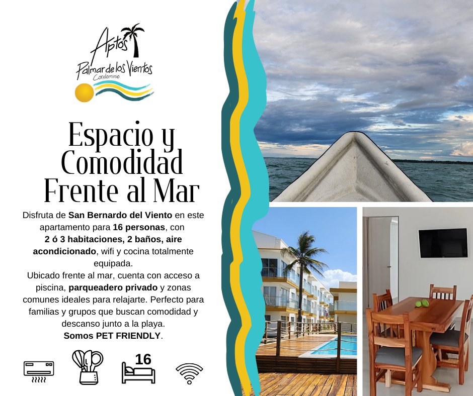 ¡Vive frente al mar en el Palmar de los Vientos! Ideal para 6 personas (ocupación máxima: 10) Recomendamos una estadía de 3 noches. Área privada: 2 camas dobles y 2 camas sencillas, 2 sofás cama, 3 aires acondicionados, nevera, lavadora, dos baños, cocina dotada: vajilla para más de 10 personas y elementos básicos para cocinar. Barras y bafle con conexión USB o Bluetooth. (no hay Wifi ni televisor, te invitamos a desconectarte) Área pública: 1 PARQUEADERO, piscina y playa pública.