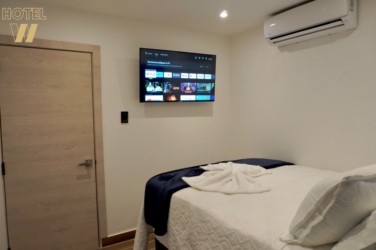 Santa Marta'nın Tarihi Merkezi'ndeki butik bir otelde çağdaş bir dubleksin keyfini çıkarın. İki geniş katı, konforlu yatakları, kliması ve özel banyosu ile üç kişi için mükemmeldir. Otelde küçük bir havuz, spor salonu var ve harika bir konumda, Katedral'e, restoranlara ve sömürge merkezindeki en ünlü yerlere sadece birkaç adım uzaklıkta.