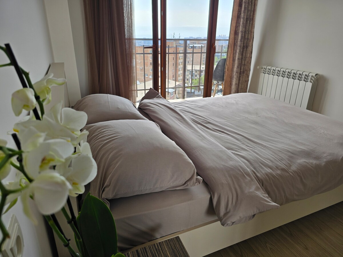 Erivan'ın göbeğinde ferah, aydınlık bir daire!Konumu harika ve restoranlar, kahve dükkanları, turistik noktalardan ihtiyacınız olan her şeye kolayca erişilebilir. Daire, seyahatiniz için ihtiyacınız olan her şeye sahiptir. Oturma odası, çekyatlı yemek alanı, mikrodalga fırın ve kahve makinesi dahil mutfak, çift kişilik yataklı yatak odası ve banyo. Sağlığınız önceliğimizdir. Evimiz, profesyonel temizlik ve stratejik dezenfeksiyon ile gelişmiş bir temizlik protokolü izler.