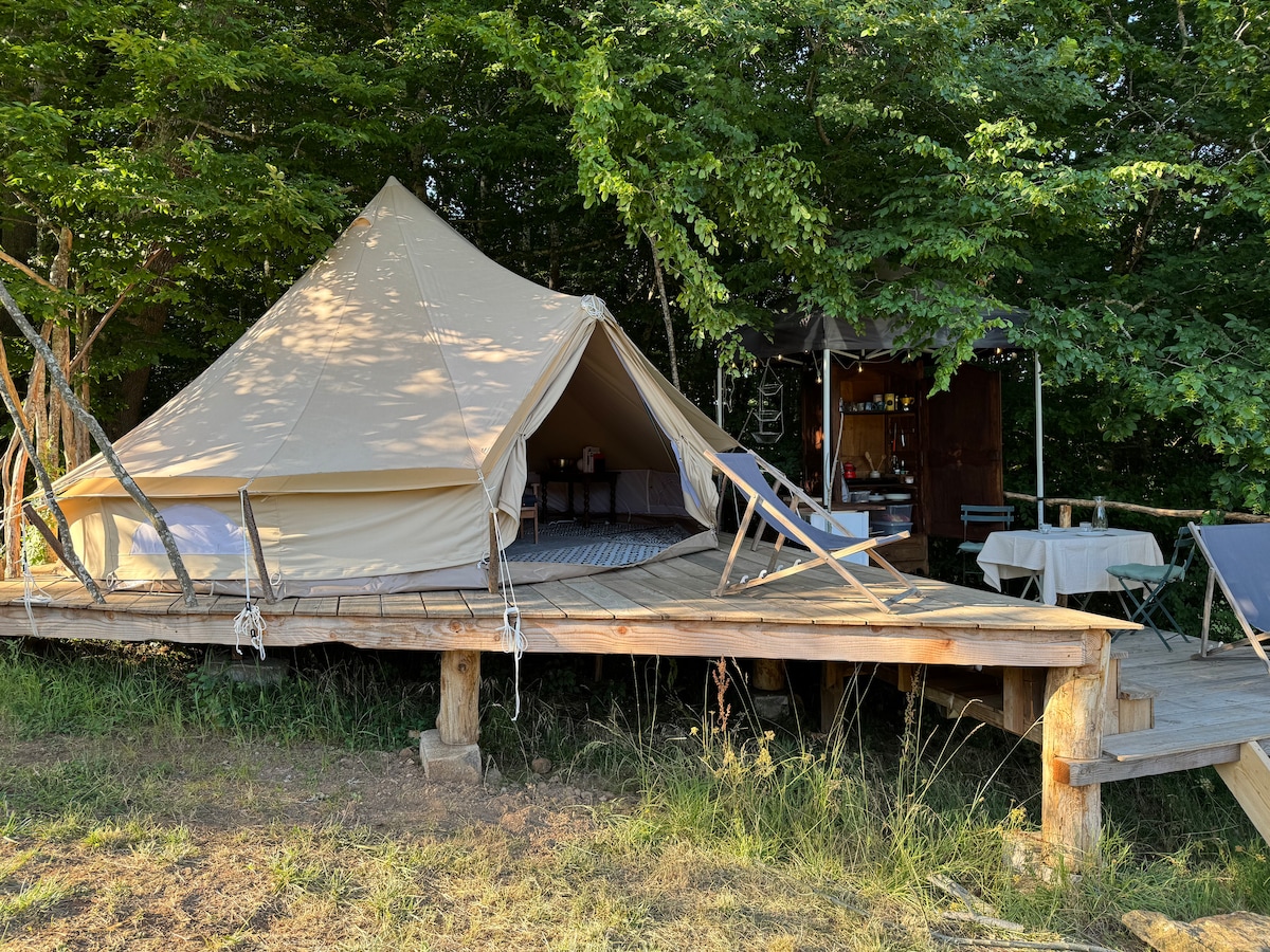 Doğanın kalbinde bir an için bağlantıyı kesmek için, unutulmaz bir konaklamanın tadını çıkarmak üzere yurt çadırımızı keşfedin. Cibinlik, 180 yatak, elektrik, mobilya, kahve makinesi ve tabak çanak mevcuttur. Sıhhi tesisat ve kuru tuvaletler 50 m'den az mesafededir. Bir gece için kendi yatak çarşaflarınızı getirin. Organik 50 hektarlık bir mülkün göbeğinde yer alan bu deneyim, doğanın çoğuyla yeniden şarj olmanızı ve yeniden bağlantı kurmanızı sağlayacaktır.