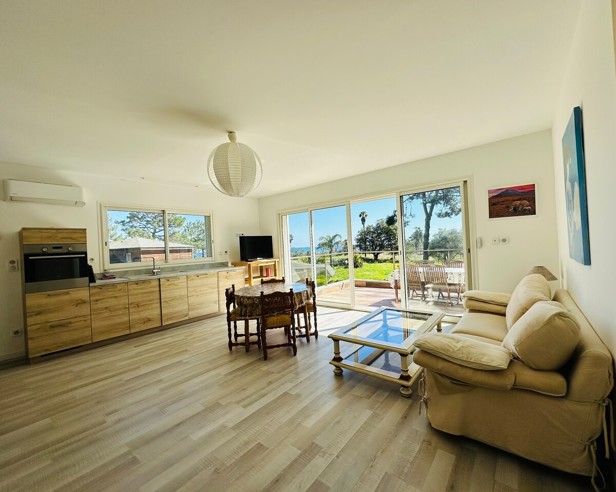 villa T3 neuve, climatisée, wifi, vue mer à 250 m de la plage. 2 chambres : 1 chambre avec un lit en 160 1 chambre avec 3 lits en 90, deux canapés dont un convertible en 140. Cuisine entièrement équipée: plaque à induction, réfrigérateur, congélateur, lave vaisselle, lave linge, four, four micro ondes,machine à café, bouilloire, grille pain...îlot central pour repas. 1 SDB avec wc 1 wc sup Terrasse de 120 m2 pour repas extérieur avec plancha et salon d été, transats. parking privé