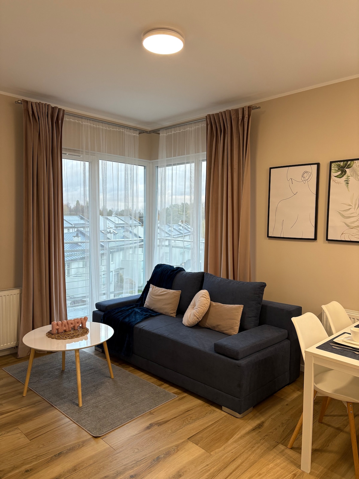 Daire, asansörlü bir bloğun üçüncü katında bulunmaktadır. Çalışması için gerekli tüm aksesuarlarla donatılmıştır: mutfak ekipmanları, çamaşır makinesi, ütü, kurutucu. Yatak odasında çift kişilik bir yatak var. Küçük mutfaklı odada uyku işlevine sahip çift kişilik bir çekyat vardır. Daire 4 kişiye kadar tasarlanmıştır. Gdansk merkezine (5 km) arabayla 8 dakikada ulaşılabilir. Dairenin yakınında (500 m) otobüs ve tramvay durağı bulunmaktadır. Havaalanına (12 km) arabayla 10 dakikada ulaşılabilir.