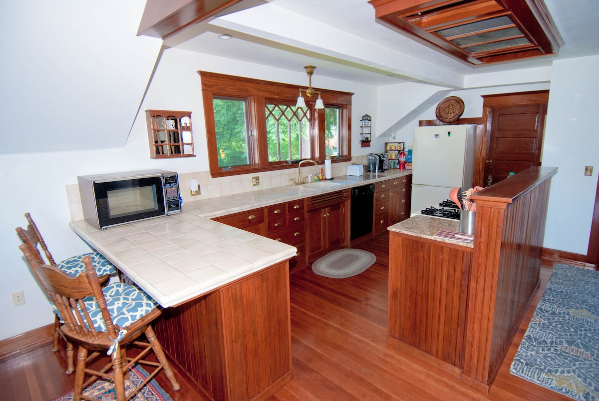 The Carriage House sits up a steep driveway, surrounded by towering Douglas Firs and majestic Maples. Modern and newly renovated, the Carriage House apartment loft is fully furnished with everything you need for a relaxing stay. A panoramic view of the Olympic Mountains will inspire and amaze all those who stay in the Carriage House. Ten minutes to the Seattle ferry, and the Puget Sound Naval Shipyard . A washer(cold water only) and a dryer are in the Cartiage House laundry room.
