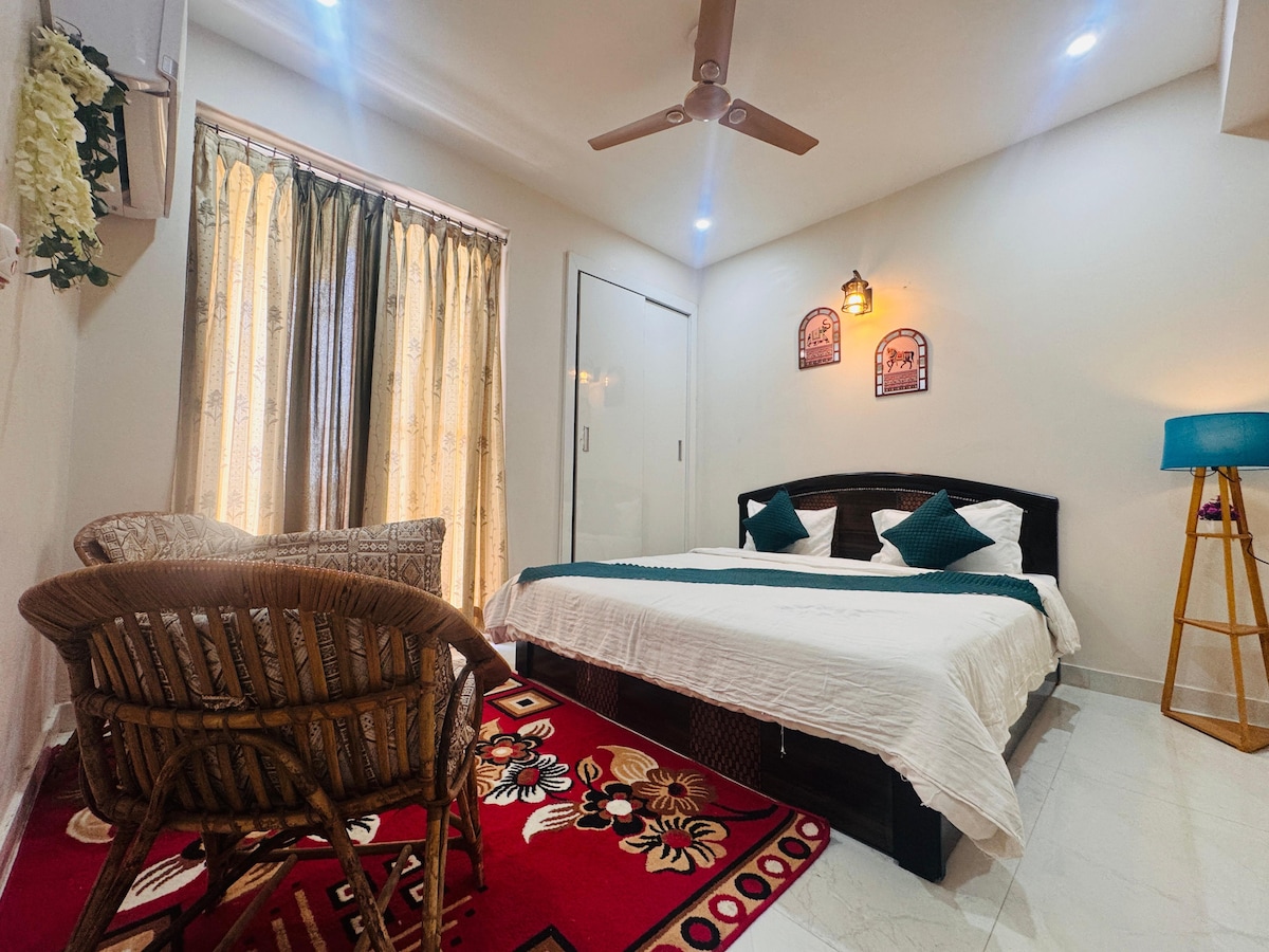Vrindavan'daki kutsal Prem Mandir'e sadece 1,5 km uzaklıktaki Bhakti Vanam'da kalın. Klimalı, yüksek hızlı kablosuz internet bağlantısı, özel giriş ve rahat bir balkonu olan geniş bir stüdyonun keyfini çıkarın. İki misafir için mükemmeldir, gerekirse ekstra yatak mevcuttur. Tapınaklara ve toplu taşıma araçlarına yakın ve scooter kiralama ayarlanabilir. İyi donanımlı bir mutfağa ve temiz bir tuvalete tam erişim. Manevi bir yerde konfor ve huzur arayan aileler veya yalnız seyahat edenler için idealdir.