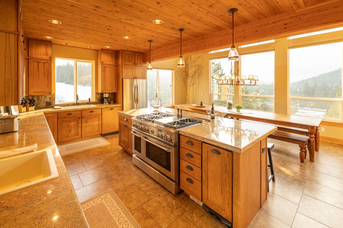 Büyük katedral pencereleri, sarmal güverte, tonozlu Büyük Oda ve ayak parmaklarınızı ısıtmak için rahat bir odun sobası ile güzel ahşap inzivada rahatlayın ve temiz dağ havasının tadını çıkarın. Oyun odasına inin ve bilardo oynayın, piyano çalın, şarap için ve sarmal deri koltukta/yatakta bir film izleyin. Konaklamanız 🧘 sırasında kayak yapmak🎿, yürüyüş yapmak, bisiklete binmek🚴, tırmanmak🧗♂️, balık🎣 tutmak, kano yapmak ve golf⛳️ oynamak için yakındaki ücretsiz uzaktan yoga için gidin. Gününüzü, yorgun bacaklarınızı yıldızların altında bir jakuziye sokarak bitirin ✨ ve gerektiğinde tekrarlayın.