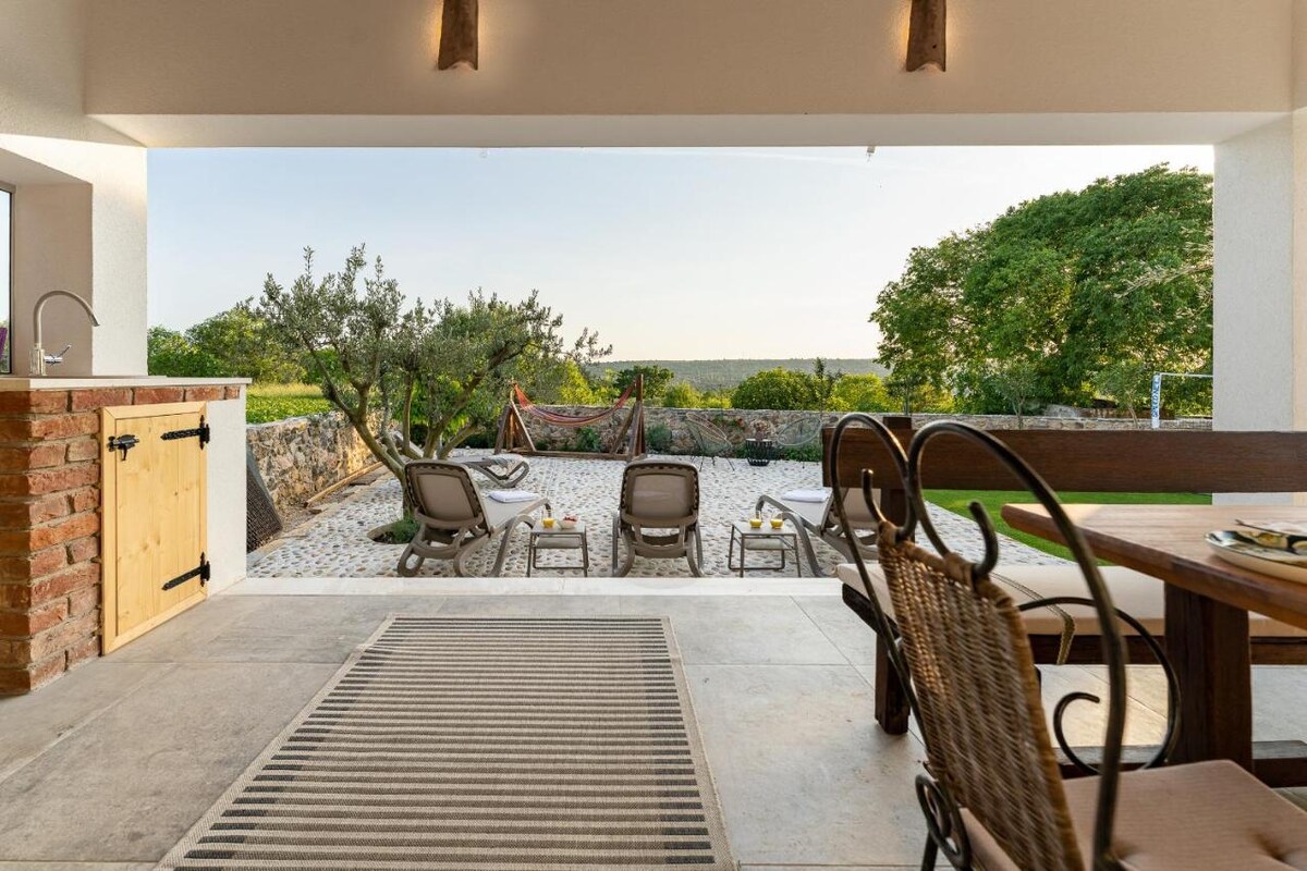 Deniz manzaralı harika lüks taş ev. 6 kişilik (1 ana yatak odası teraslı, 1 yarı açık yatak odası köprülü). Geniş bir banyo, yemek, oturma, 2 modern mutfak, gölgeli veranda, 2 kapalı teras ve şömineye sahiptir. Zrmanja Kanyonu (11 km) ve "Bijela Nehri Kanyonu" (200 m) gibi mülk kamp tesislerine ve doğa noktalarına erişim. Rüzgar sörfü, kano, tırmanma keyfini çıkarın.