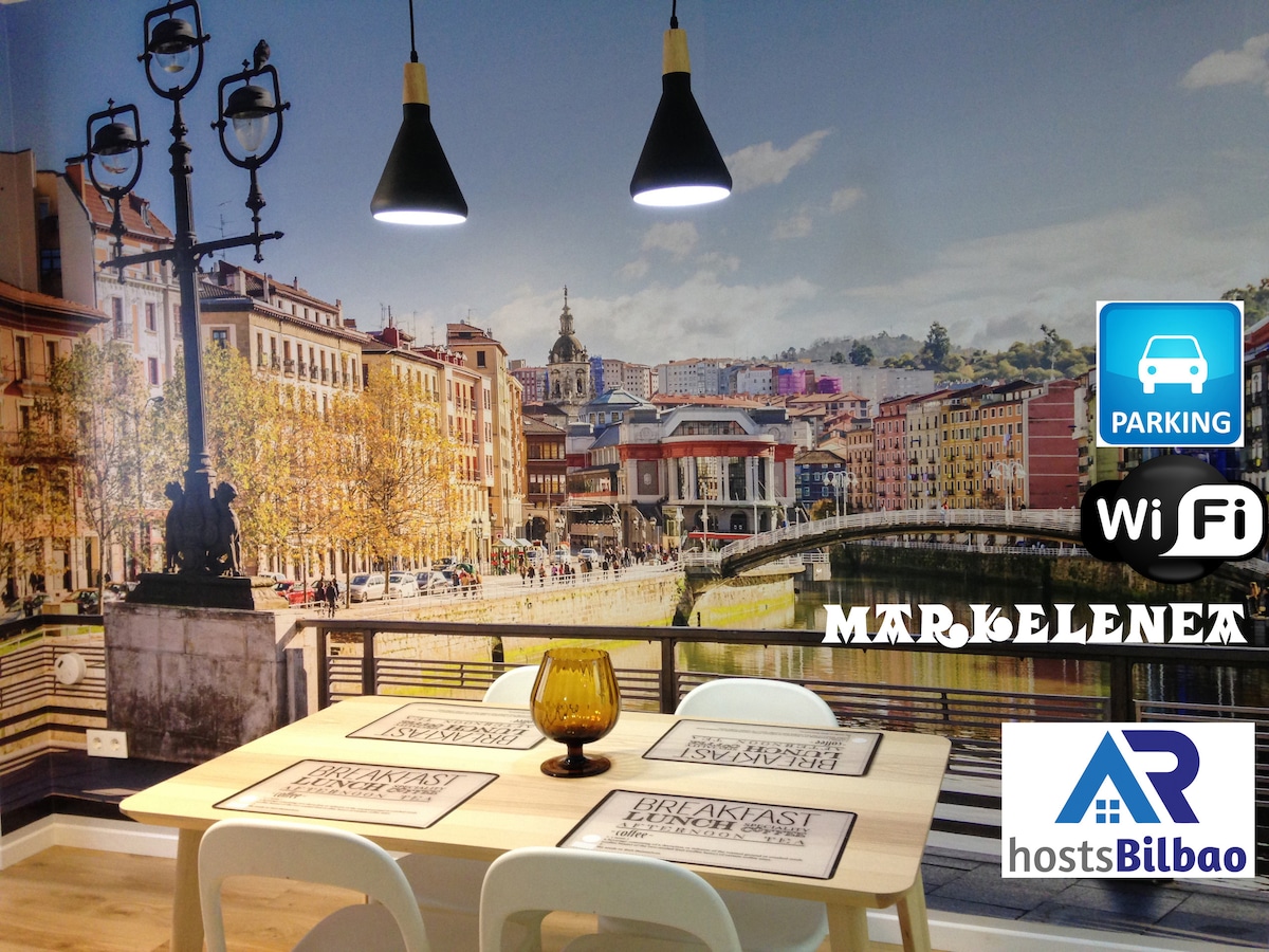 MARKELENEA - Espacioso piso exterior completamente reformado y equipado en zona tranquila de las inmediaciones del Casco Antiguo de Bilbao. 70 m², capacidad 4 personas, 2 dormitorios, aseo y baño completo, cocina totalmente equipada, zona de trabajo, salón con sofá cama, terraza, WIFI. Parking disponible a 5 minutos a pie (consultar tarifas). Ideal para disfrutar de una agradable escapada, vacaciones o por trabajo. Edificio hormigón con ascensor, portal accesible. Gestionado por AR hostsBilbao.