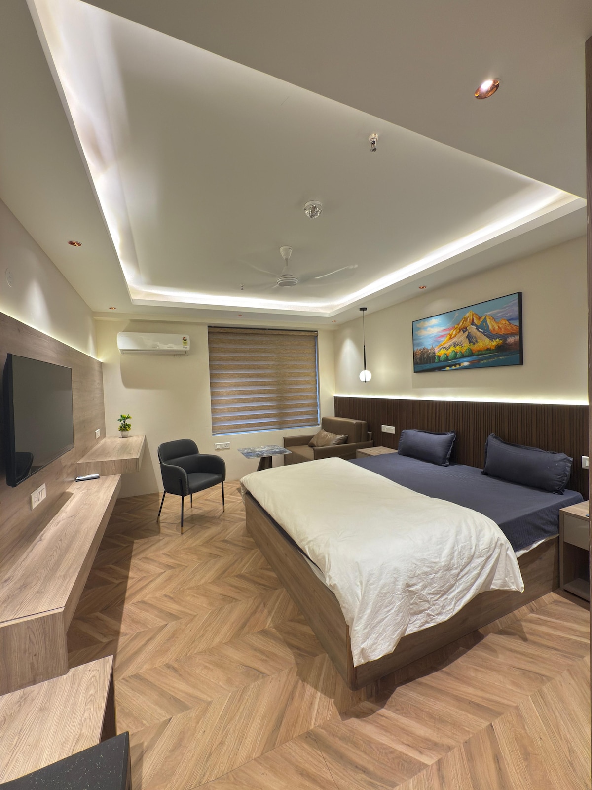 Ev sıcaklığı ve lüks bir otel havasıyla bu sakin ve lüks stüdyoda arkanıza yaslanın ve rahatlayın. Lüks bir çift kişilik yatak ve modern dekorasyonla döşenmiştir. Olanaklar: 7 gün 24 saat açık bakkal. Modern küçük mutfak Yüksek hızlı kablosuz internet bağlantısı ve TV Kulenin dışında güvenli park yeri, ancak 7 gün 24 saat güvenlikli İlk 2 katta ticari mağazalar vardır ve şunları sunar: Çamaşırhane hizmetleri Salon Kafe Tıbbi malzeme mağazası India Expo Mart, Buddh International Circuit'e kolay erişim. Çiftler, yalnız seyahat edenler veya iş ortakları için mükemmeldir.
