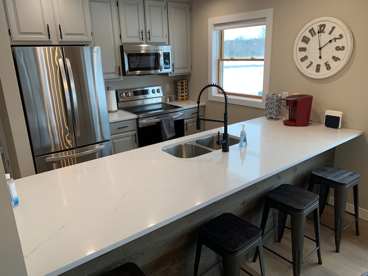 Nehir kenarında kaçış, üstün konfor, ferah, Lambeau Field yakınında. Roku ile beş adet 55 inç düz ekran! Jakuzi, ızgara, çitle çevrili bahçe. Tam stoklu mutfak! Ex-lg ada oyun masası olarak da kullanılıyor. Keyfiniz için oyunlarla dolu dolap. Bira fabrikalarına, restoranlara, kahve dükkanlarına, akşam yemeği kulüplerine, patikalara, Walgreens'e yürüyün... 2 şömine ve mevcut en hızlı internet. 10 kişilik. 3 tam banyo. Bolca garaj park yeri. Ana yatak odası süiti. Çift masalı geniş ofis, bar masalı 4 mevsimlik oda.