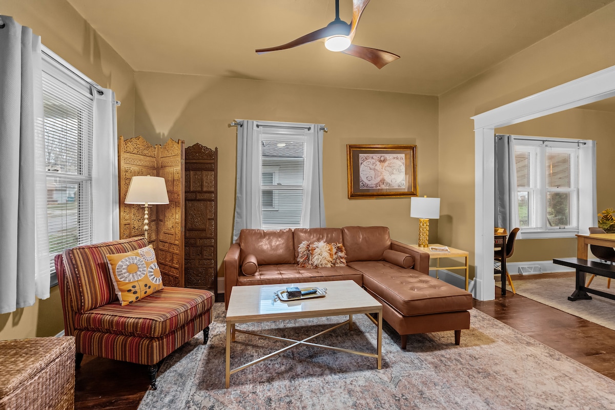 Welcome to Pickwick Places where we host 2 amazing apartments in Springfield's favorite neighborhood, Rountree. The two bedrooms comfortably sleep 4. Marble countertops from a local quarry and coffee from a local roaster add to the experience. Details make this stay easy, comfortable, and the ultimate Springfield experience. No cleaning fee - a straightforward price. Plus, full laundry, wifi, and beautiful spaces. A two-bedroom suite and full kitchen for the price of a single hotel room.