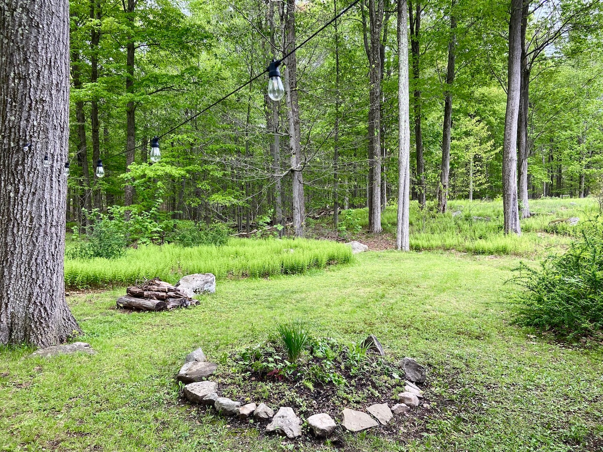 Güzel arka bahçesi ve ateş çukuru olan modern kır evi