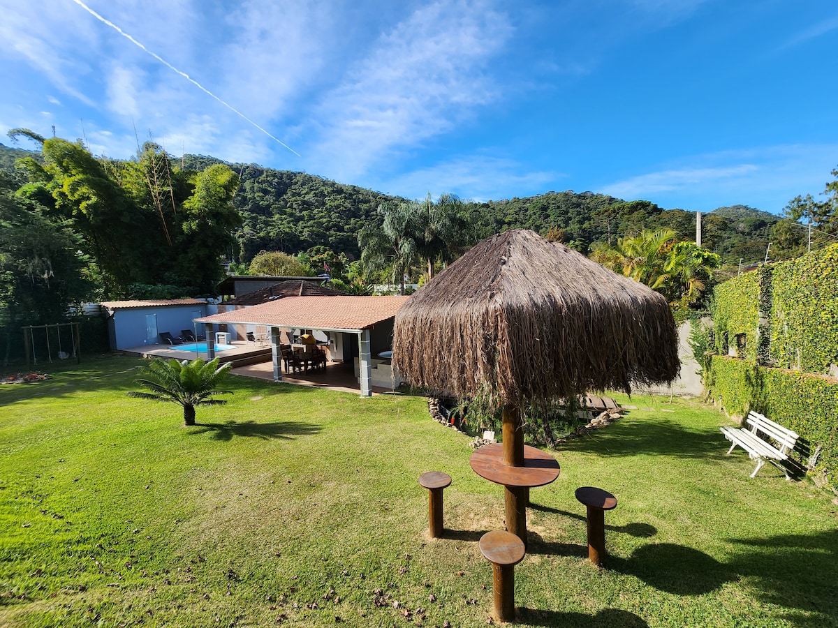 Aconchego de Vó'ya hoş geldiniz! Sivrisinek ağı, 3 konforlu yatak odası, 2 tam banyo, geniş oturma odası, donanımlı mutfak ve 2 balkon ile tüm ev Özel havuz ve barbekü Evcil hayvan dostuyuz! 4 ayaklı arkadaşlarınız bayılacak! (Bunları rezervasyona eklemelisiniz!) Doğanın ortasında, geniş ve özel yeşil alanla harika ve dinlendirici manzara. Arazi tamamen çitle çevrili. Siz ve evcil hayvanlarınız için güvenlik. Futbol sahası, kort, göl ve çocuklar için oyuncaklar bulunan güvenlikli site