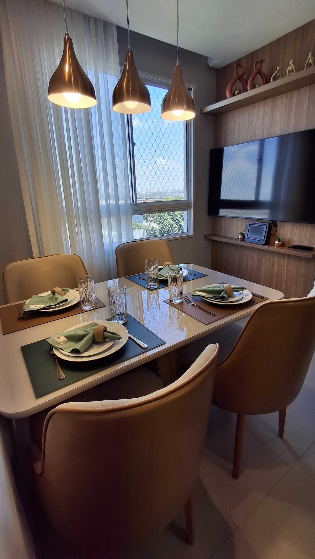 Apartamento novo, garagem inclusa, confortável, estiloso e completo. Wifi de alta velocidade. O piso térreo da acesso a diversas lojas, restaurantes, mercado 24 horas ao lado. A trabalho ou a lazer, a comodidade de ter tudo por perto. Projetado para receber tanto estadias curtas quanto longas. O condomínio Helbor Patteo Bosque Maia, possui localização privilegiada, próximo aos melhores restaurantes e bares e em frente ao Parque Bosque Maia.