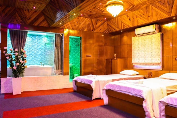 Jakuzili geniş grup konaklaması. Birden fazla yatak