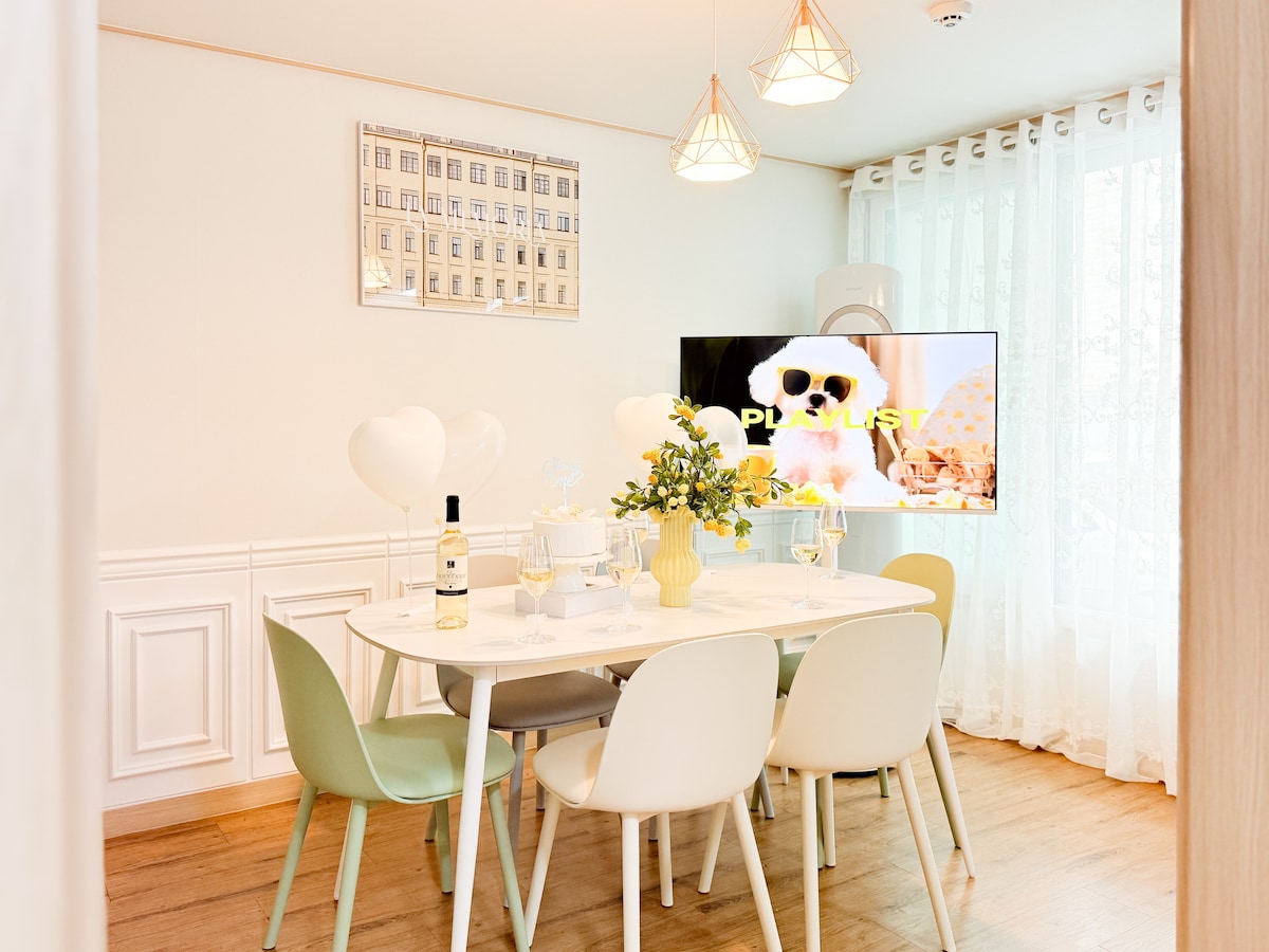 안녕하세요 😄 프렌치 감성을 좋아하는 수집가가 정성스럽게 꾸민 114m2(34평)의 감성 하우스입니다 오랜기간 동안 수집 해 온 퀸즈 웨지우드&제스퍼 웨지우드 소품과 모던한 가구들을 조화롭게 배치해 공간 전체에 은은한 프렌치 무드를 담았습니다 숙소 문을 여는 순간! 따뜻하고 아름다운 분위기를 바로 느끼실 수 있을 거예요 34평 넓은 공간에 1. "큰 거실 + 최고급 안마의자" 2. "독립된 3개의 침실" 3. " 8인 대형식탁 " 4. "깨끗한 욕실 2개" 5. "감성 테라스"까지 갖춰 가족, 친구분 모두 편안하게 쉴 수 있는 넉넉하고 아늑한 숙소예요 하루의 여행이라도 더 특별해 지길 바라는 마음으로 공간의 작은 디테일까지 정성스럽게 준비해 두었습니다 여러분의 소중한 시간 이곳에서 내집처럼 편안하게 쉬어가세요 "my cozy, lovely home"