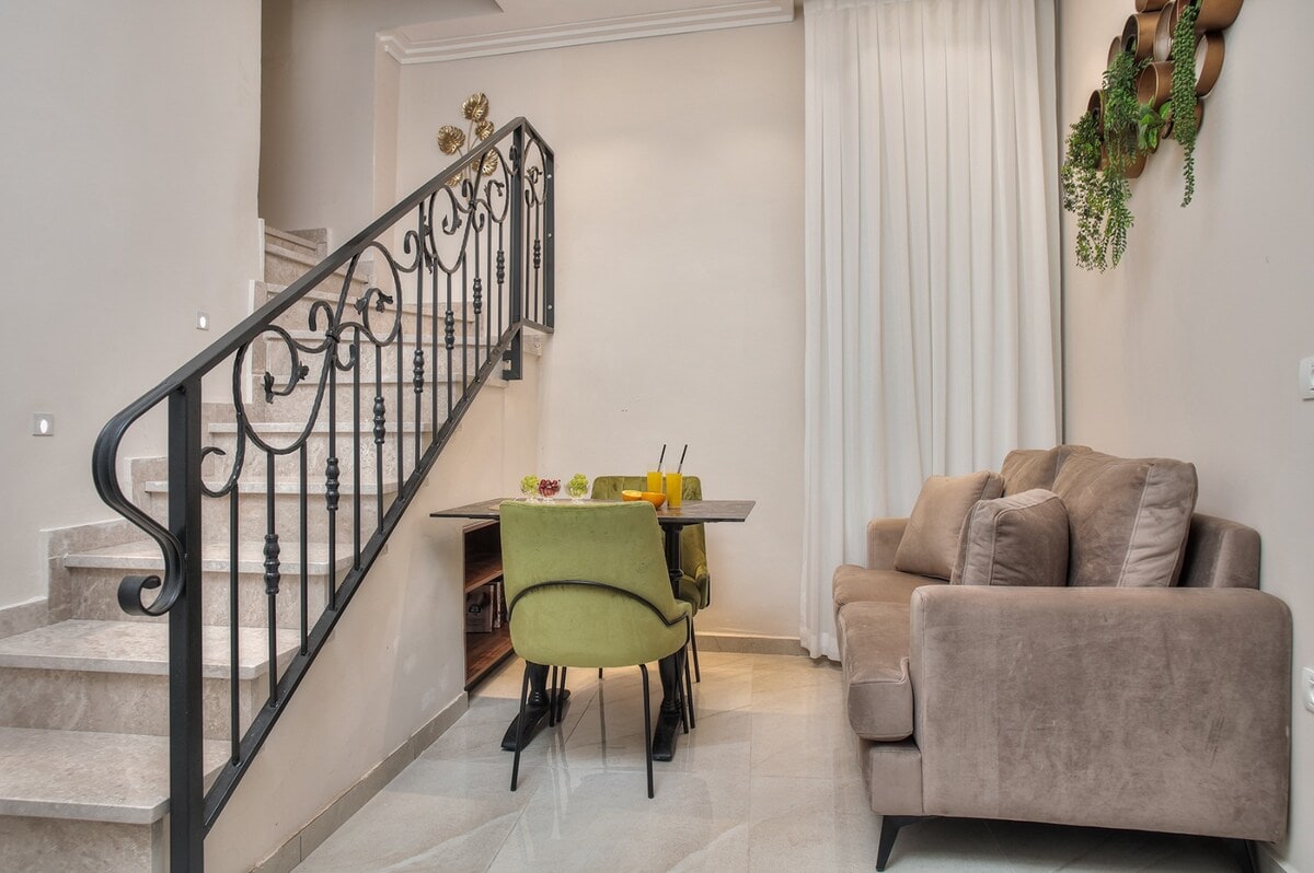 Unwind in this chic 4th-floor apt (walk-up) with country-modern style. Steps from Haifa's Baha'i Gardens (UNESCO site!), it offers comfort & location. Relax in the light-filled living area, cook in the kitchen, or unwind in the hot tub after exploring. The bedroom provides a peaceful escape. Haifa's culture awaits! Explore the Gardens, savor cafes, or delve into heritage centers. Mingle at nearby pubs. This Haifa gem offers an unforgettable stay. Book your getaway today!