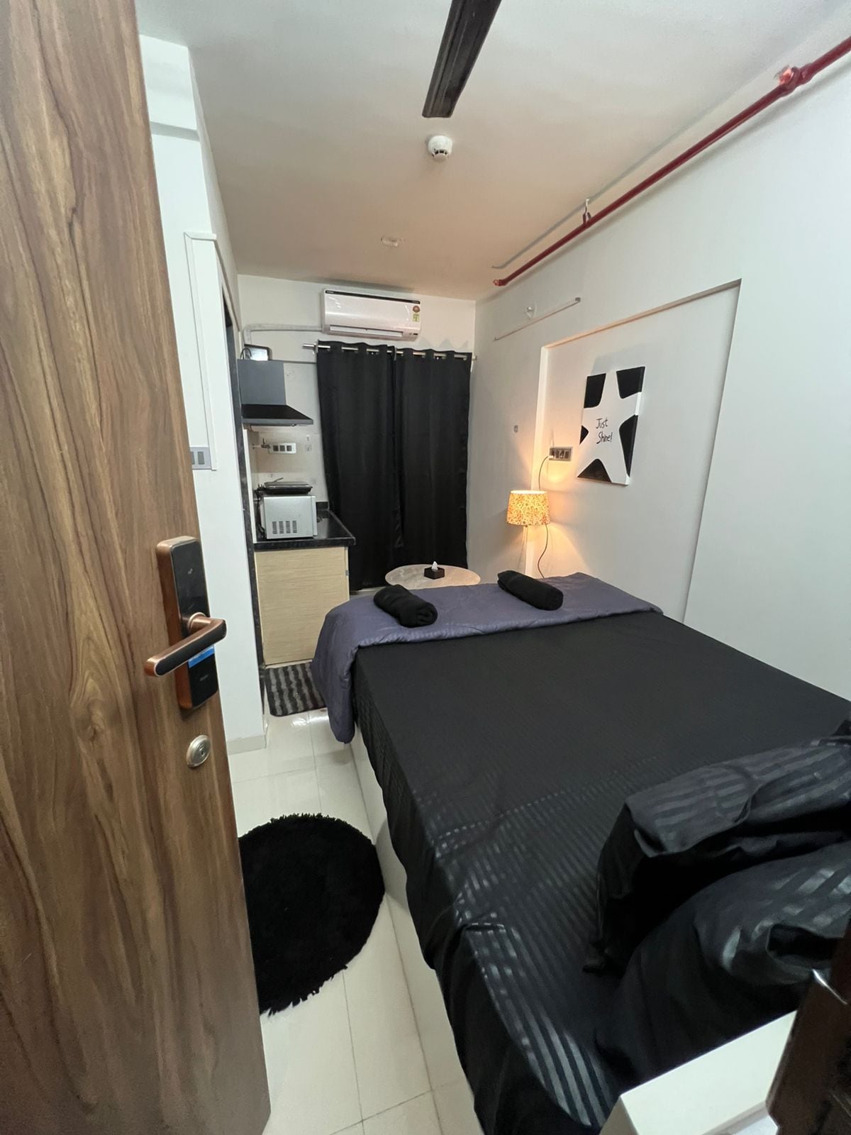 Step into 404 Luxe Haven, a thoughtfully designed 404 sq.ft studio apartment blending modern comfort, warm lighting, and elegant interiors. Featuring a signature mustard velvet sofa, a cozy queen bed framed with floral backlighting, a stylish modular kitchen, and a relaxing balcony with greenery, this space is perfect for singles, couples, or business travelers. Enjoy a peaceful ambiance with contemporary décor, soft neutral tones, and every essential curated for a seamless stay.